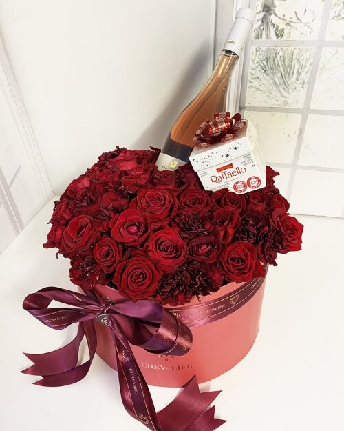 ₪1,377.00 – ₪1,452.00קופסת פרחים ענקית שחלומה של כל אישה לקבל, שופעת כ- 45 ורדים אדומים רעננים, בשילוב 20 פרחים נוספים שיוצרים סידור אלגנטי ורומנטי. ניתן לבחור מארזים משולבים עם יין או שוקולדים. *היין המוצג בתמונה הינו טפרברג אימפרשן רוזה 2019 (לבחירת יין חלופי תחייגו אלינו – 073-3744248)