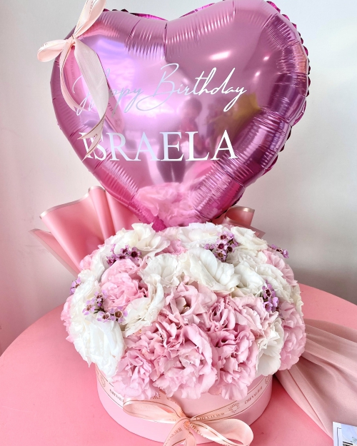 סידור עגול קסום בצבעי לבן, ורוד, הסידור מגיע עם בלון הכולל הקדשה אישית (עד 4 מילים, ניתן לרשום בהערות בהזמנה) וסרטים רומנטיים. בתמונה המוצגת הסידור בגודל “בינוני”.