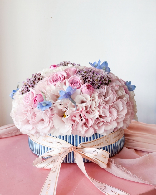 זר קסום בגווני ורוד ותכלת עטוף באריזה איכותית מלאה סטייל ועמידה במים. * הזר המוצג בתמונה הינו גודל רגיל -“בינוני”
