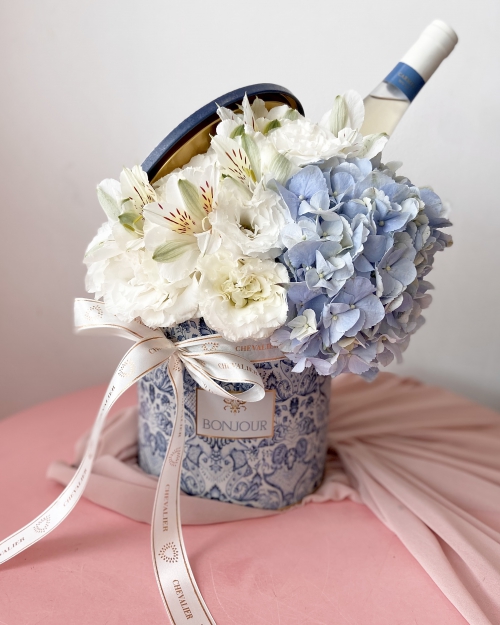 מארז פסח מרהיב שיש בו הכל!!! קופסת עוגיות קסומה, שבתוכה יצרנו סידור פרחים מרהיב בגווני לבן, תכלת וכחול וכל היופי הזה משולב עם יין לבן כשר לפסח… כן כן.. גם פרחים מושלמים, גם יין וגם קופסא שנשארת לשימוש בבית… *ניתן לצרף הגדה של פסח הכי סטייל שיש. *גוון הפרח התכלת משתנה בהתאם למלאי החנות.