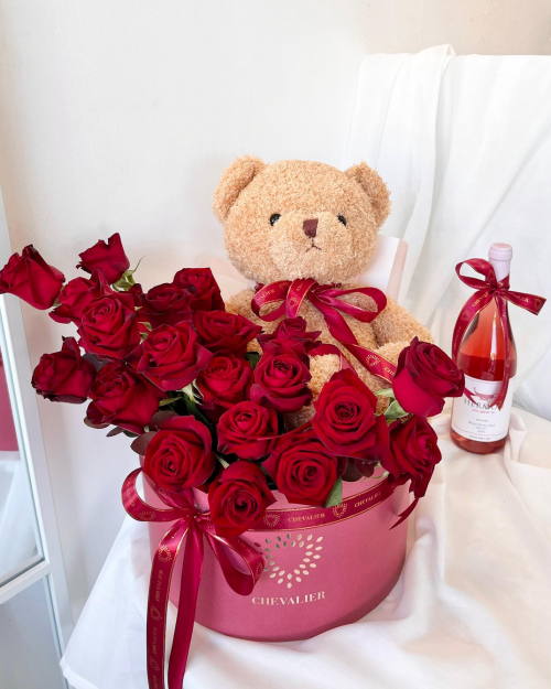 המארז המושלם להראות את האהבה שלכם, מארז עם 25 ורדים אדומים ודובי מפנק בקופסא רומנטית ענקית. ניתן לצרף יין למארז לבחירתך.
