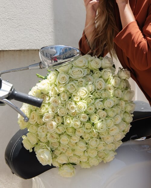 ₪1,400.00 – ₪2,800.00זר ורדים עצום ועוצר נשימה, בצבע לבן – קרם, מרשים למראה, המכיל בין 100 ל- 200 ורדים ע”פ בחירתך. * הדוגמנית בתמונה אוחזת בזר המכיל כ- 150ורדים.