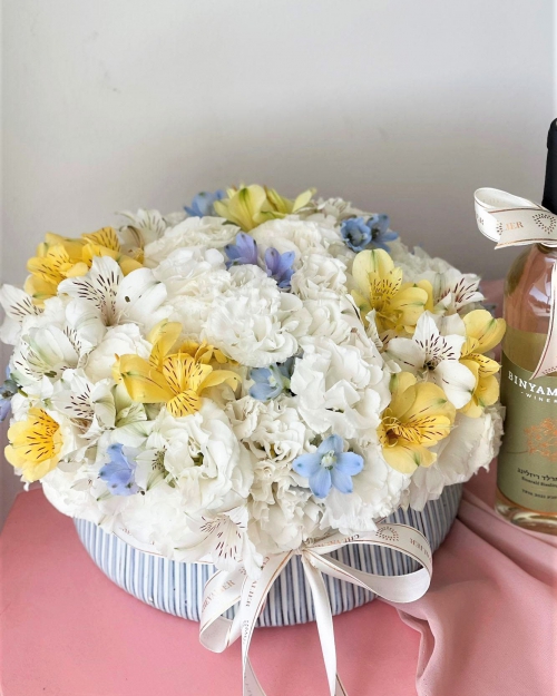 ₪450.00סידור עגול בכלי חרסינה עם פסים כחולים משלוב פרחים בגווני תכלת, לבן וצהוב. מומלץ לצרף יין לבן.