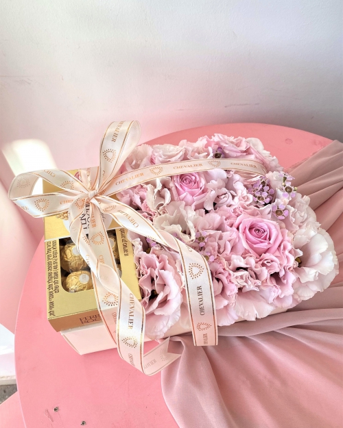₪269.00סידור בקופסא מרובעת משולב עם פרחים מרהיבים בגווני ורוד ומארז שוקולד פררו רושה עטופים בסרטים רומנטיים.