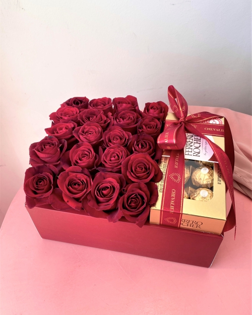 ₪339.00סידור בקופסא מרובעת משולב עם 20 ורדים אדומים ורומנטיים ומארז שוקולד פררו רושה עטופים בסרטים מלאי סטייל.