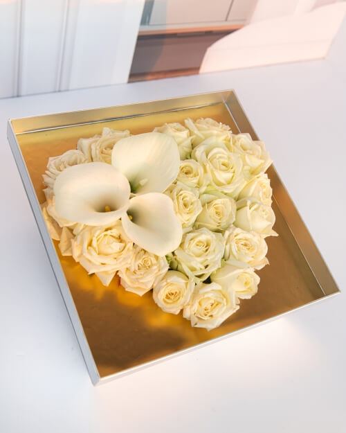 ₪300.00סידור פרחים בצורת לב המגיע בקופסא איכותיות ועבה בצבע כסף, הסידור מכיל ורדי אוולנש בצבע קרם ו- 3 קאלות לבנות היוצרות פרח משגע. הסידור מעוטר בסרטי סאטן רומנטיים.