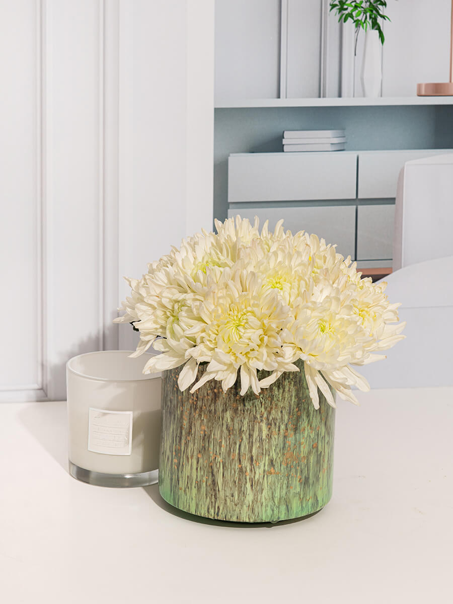 אגרטל זכוכית בצבע טורקיז המשתלב נפלא עם פרחי חרצית לבנים.