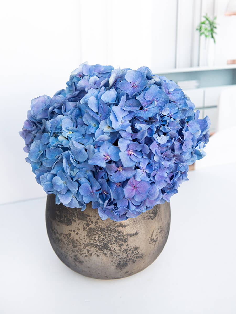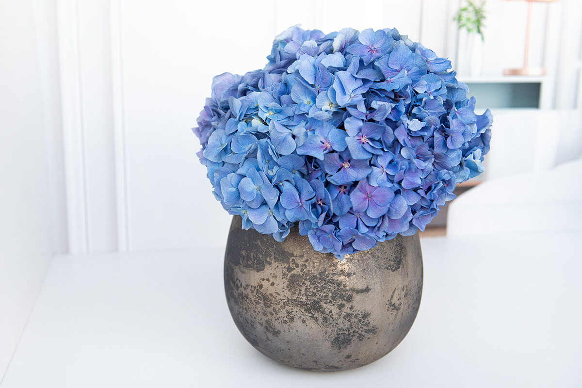 אגרטל זכוכית כסוף, מלא בפרחים כחולים מהפנטים.