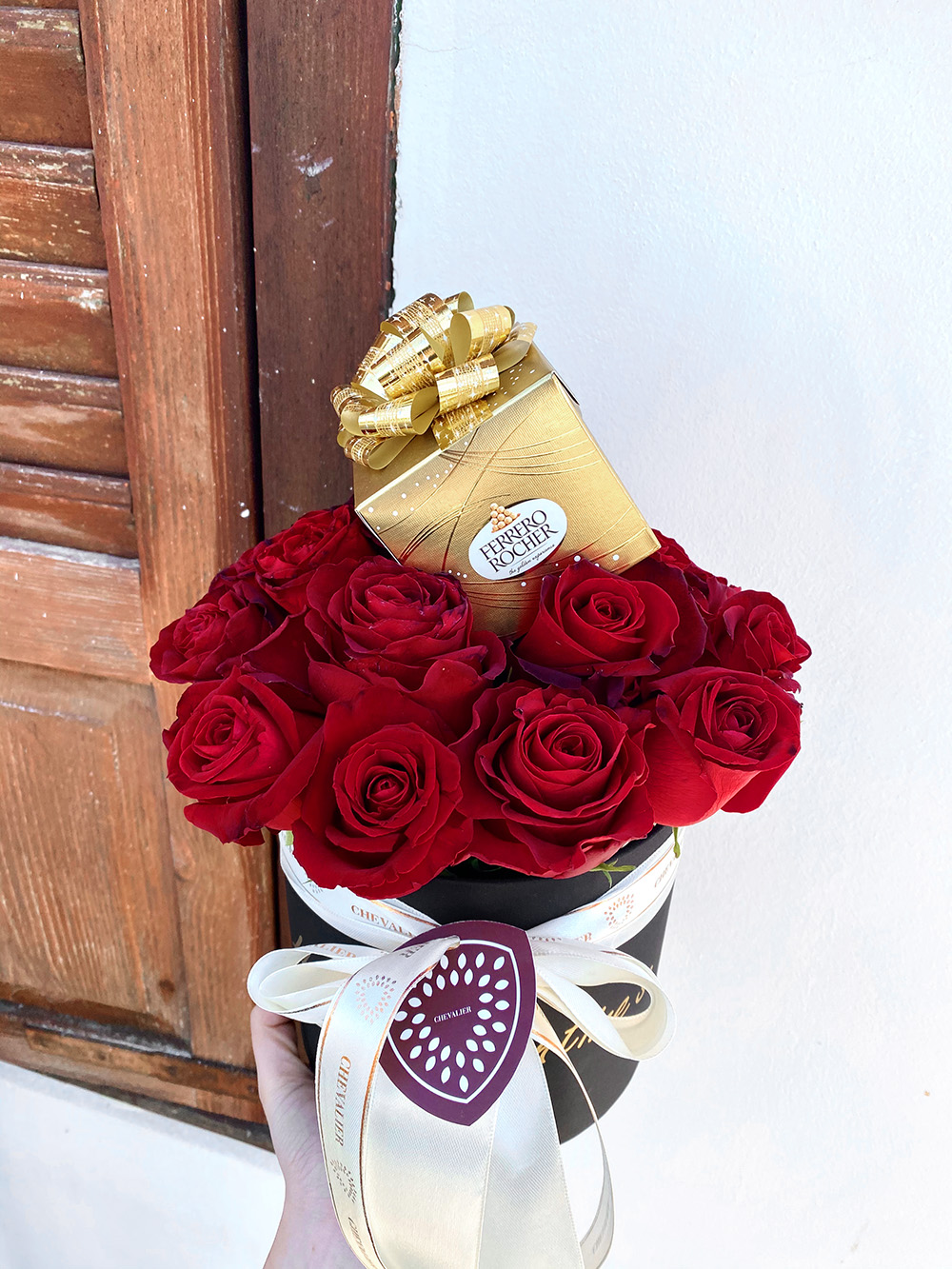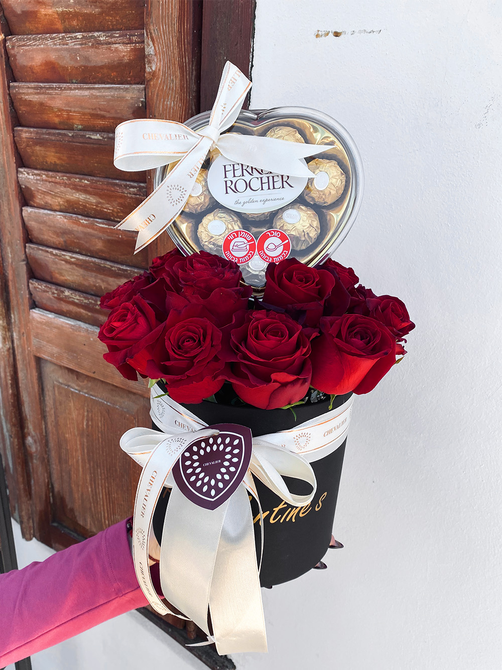 קופסת ורדים אדומים יוקרתית ואלגנטית בצבע שחור, המשולבת עם מכסה, הקופסא קיימת ב- 3 גדלים. בתמונה המוצגת הקופסא בגודל “בינוני” המכילה 16-18 ורדים. ניתן להוסיף למארז שוקולד פררו רושה.