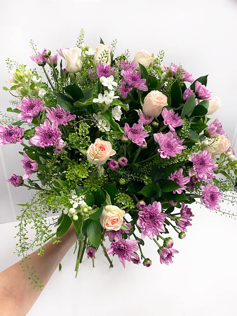 זר עשיר וקסום בצבעי ורוד, לבן וירוק.