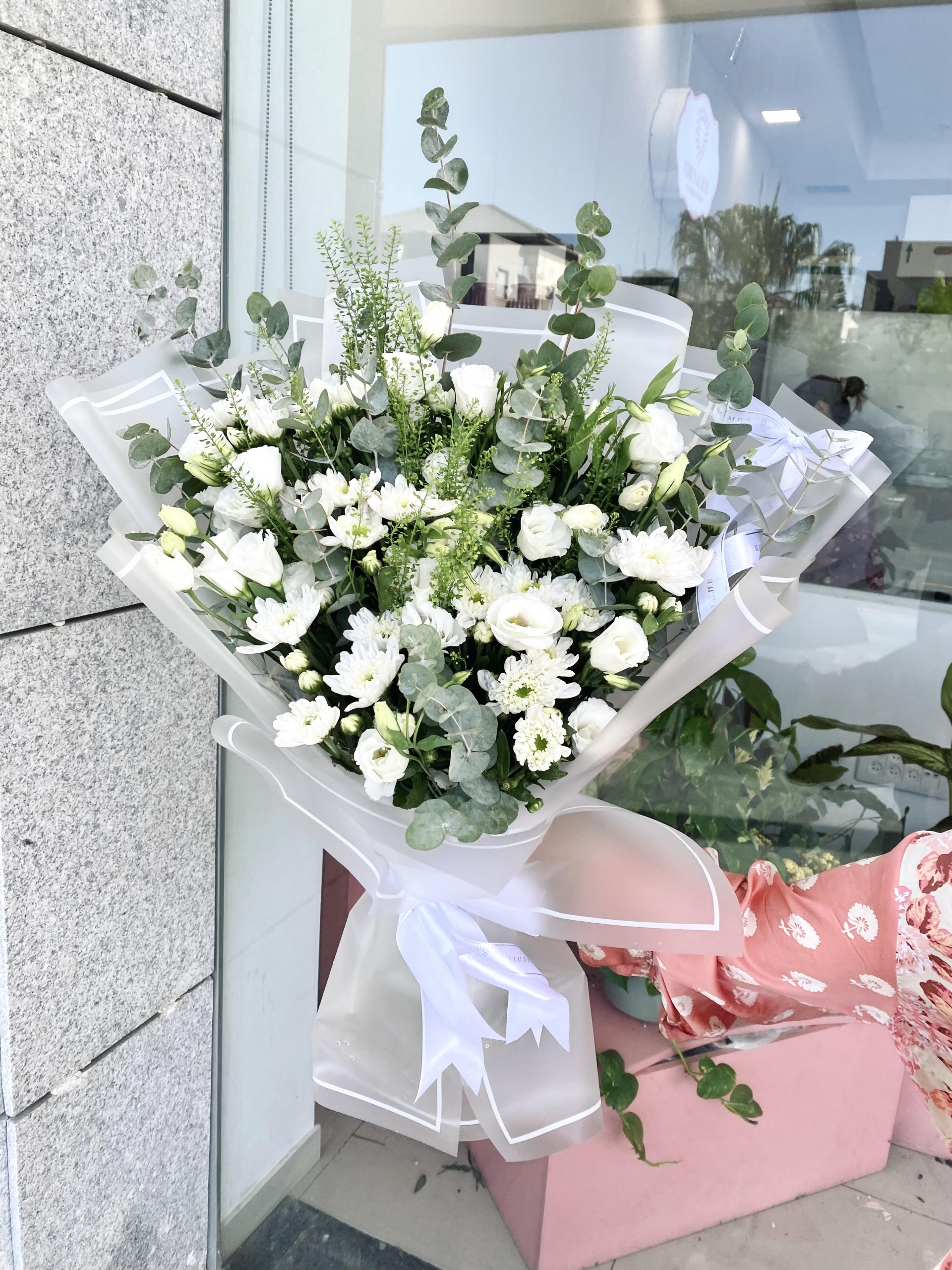 זר לבן פרונטלי בגווני לבן המשלב ליזיאנטוס וחרציות.