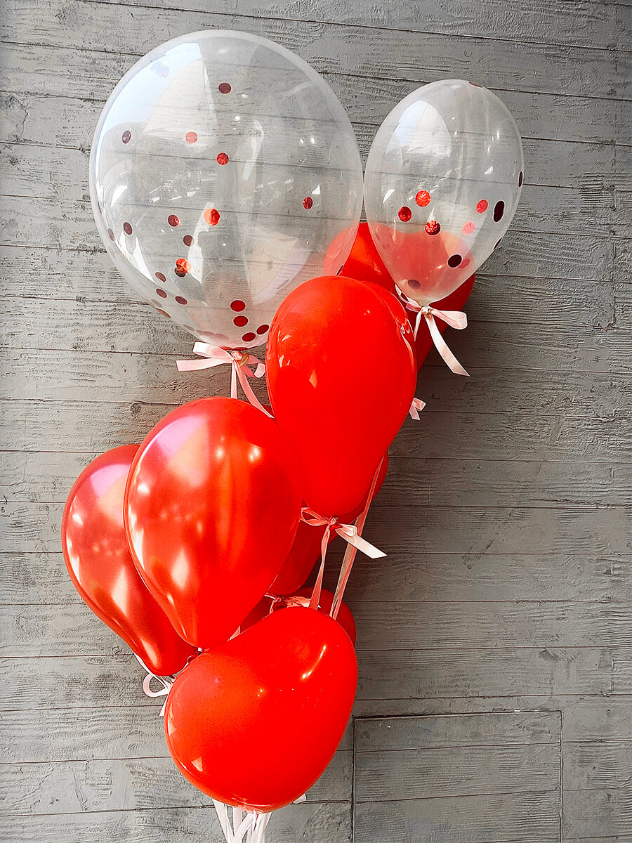 זר בלונים המכיל בלון שקוף גדול עם קונפטי אדום, בלון שקוף קטן עם קונפטי אדום, 3 בלוני כרום אדום ו- 4 בלונים לב אדום.