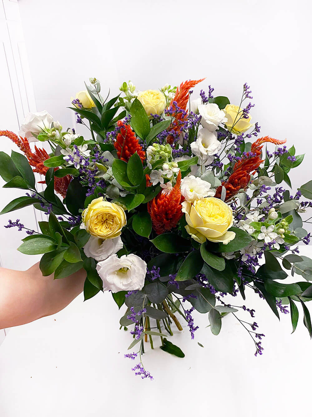 זר צבעוני ועשיר המכיל ורודים, צלוזיה, ליזיאנטוסים, טווידה ועוד