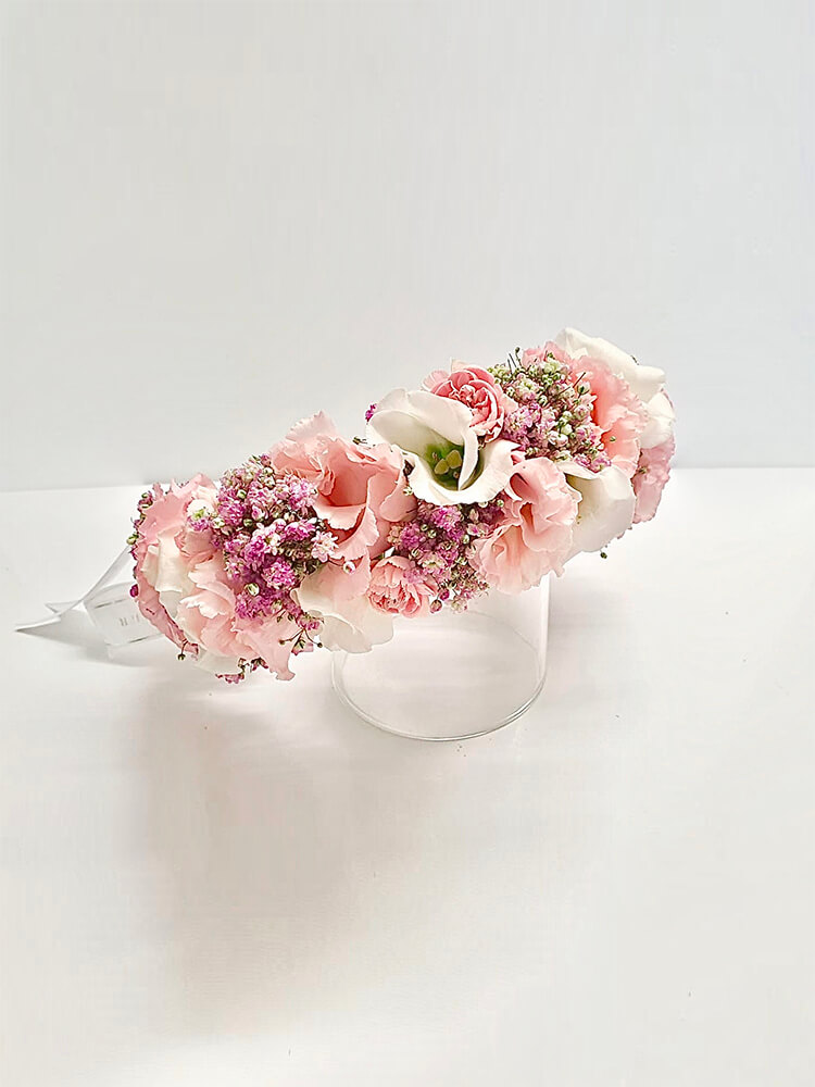 סידור ראש שופע בפרחים בגווני ורוד ולבן המתאים לברביות ונסיכות אמתיות.