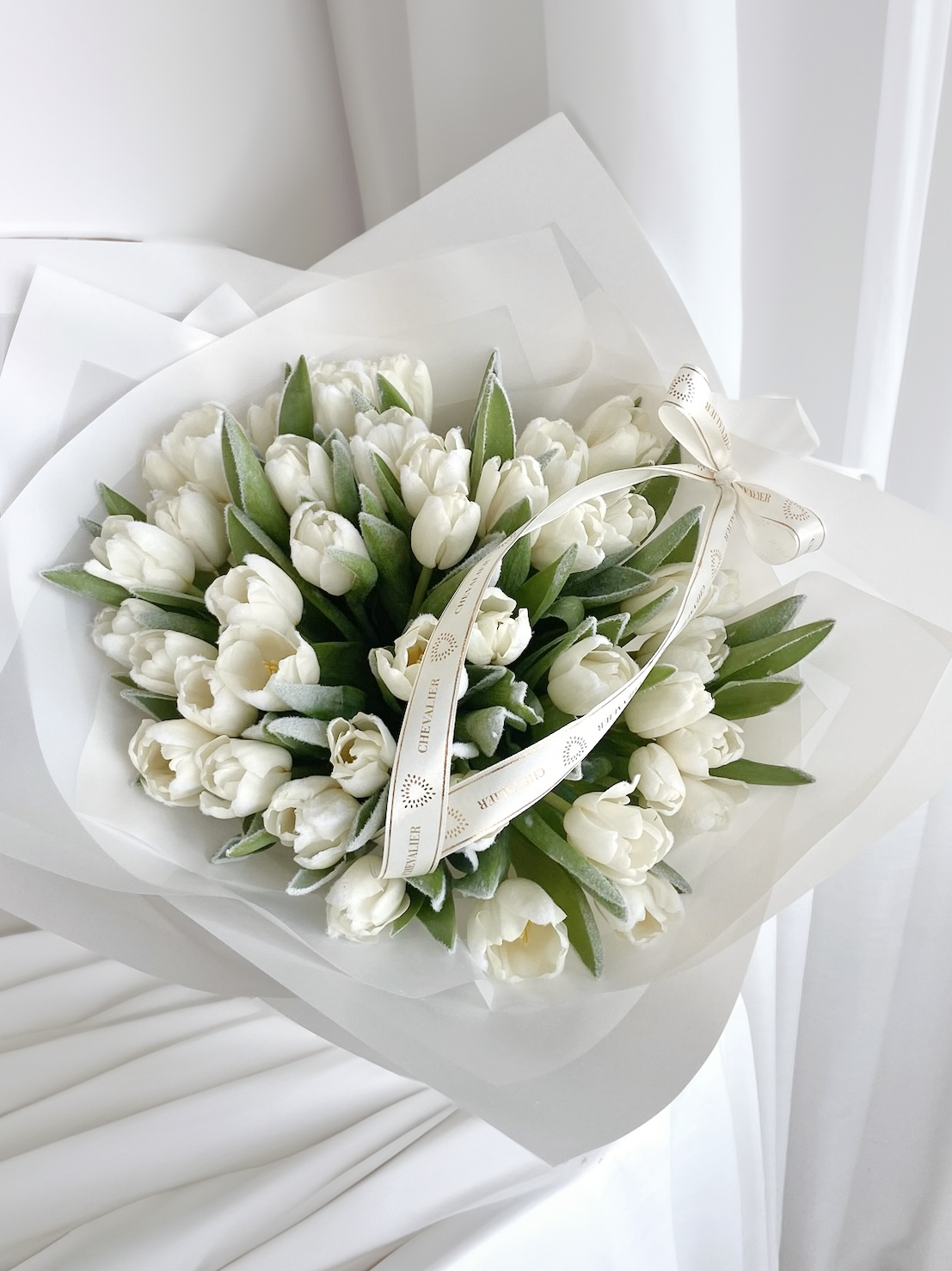 זר טוליפים לבנים יוקרתיים (כמות הטוליפים משתנה בהתאם לבחירתך). מגיע עטוף בנייר איכותי עמיד במים, ובסרט עדין ומלא בסטייל.