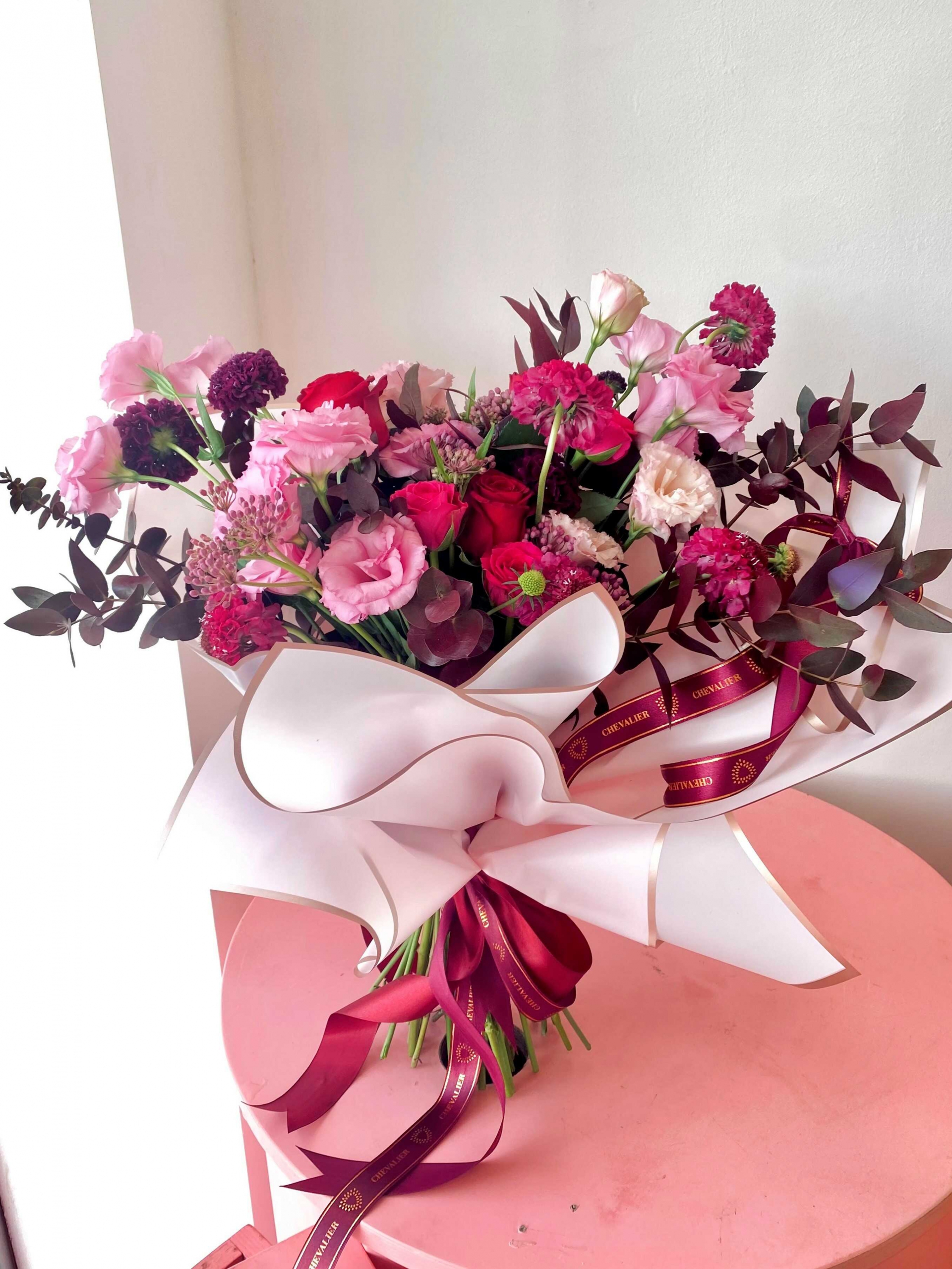 זר בגווני יין ייחודי ומרהיב, בסגנון אירופאי וקופצני המכיל מגוון סוגים מפרחי העונה, עטוף בנייר עמיד במים וסרטי סאטן.