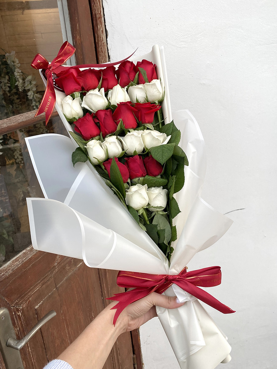 זר ורדים מדורג ורומנטי המכיל בין 15 ל- 31 ורדים אדומים ולבנים (כמות הורדים משתנה בהתאם לבחירתך). מגיע עטוף בנייר איכותי עמיד במים, ובסרט עדין ומלא בסטייל.