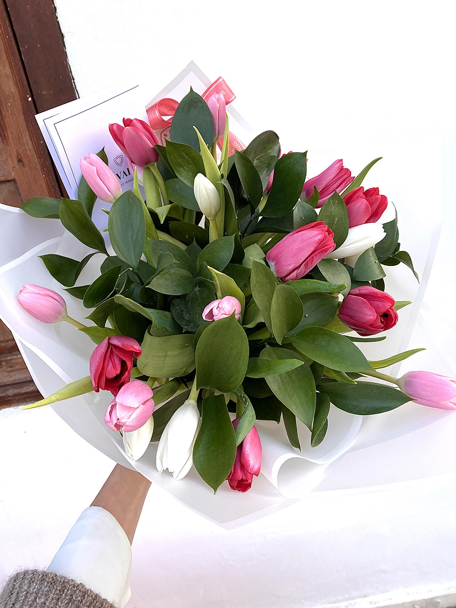 זר טוליפים יוקרתי בגווני לבן ורוד ואדום (כמות הטוליפים משתנה בהתאם לבחירתך). מגיע עטוף בנייר איכותי עמיד במים, ובסרט עדין ומלא בסטייל.