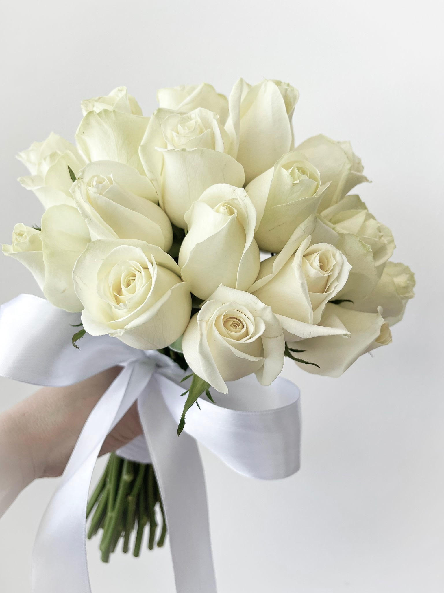 זר כלה קלאסי עם כ- 31 ורדים לבנים/קרם טריים שאינם פתוחים בשזירה עגולה ומדורגת.