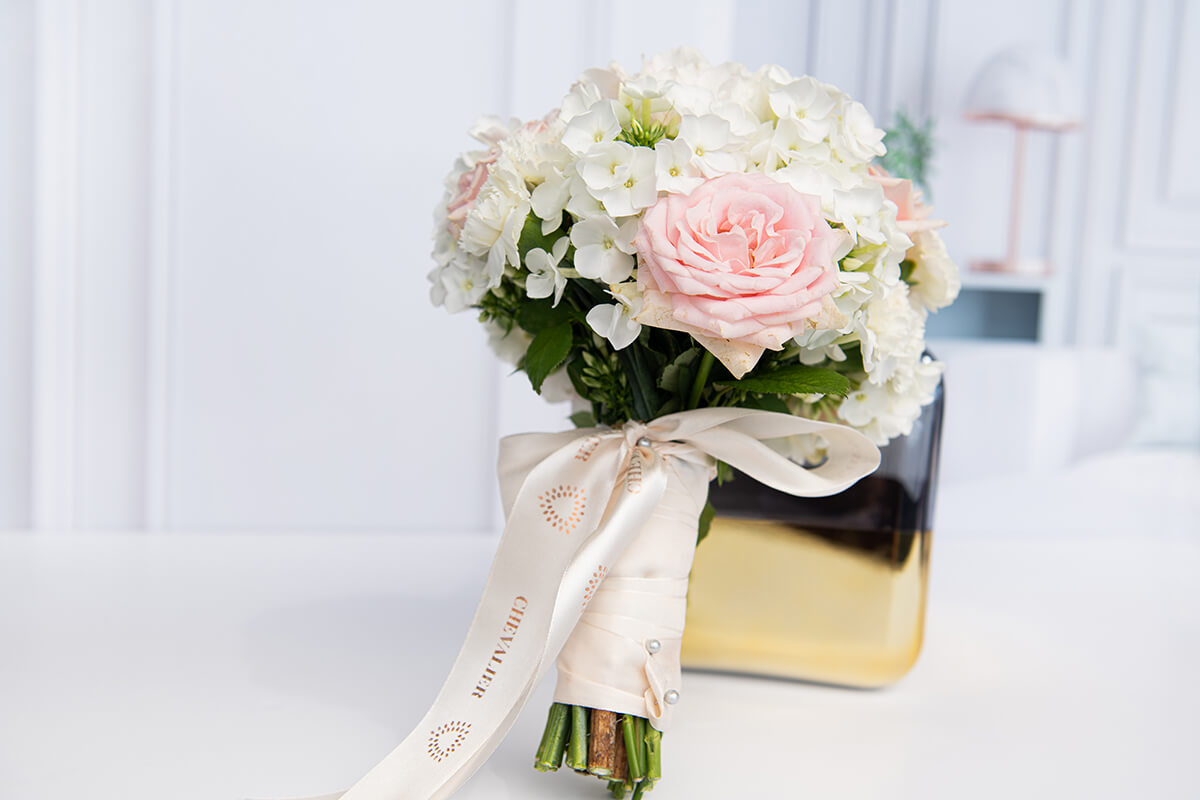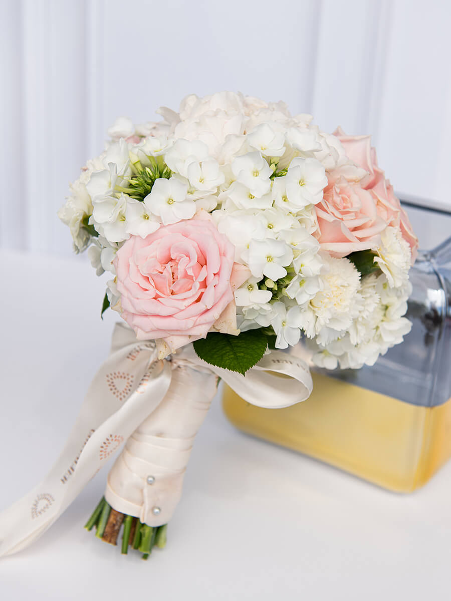 זר כלה אלגנטי ורומנטי, משולב ורדים בצבע ורוד בייבי, פלוקסים לבנים, ופרחים נוספים.