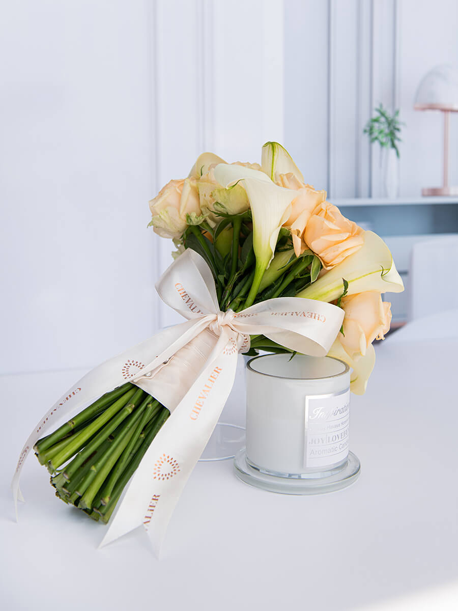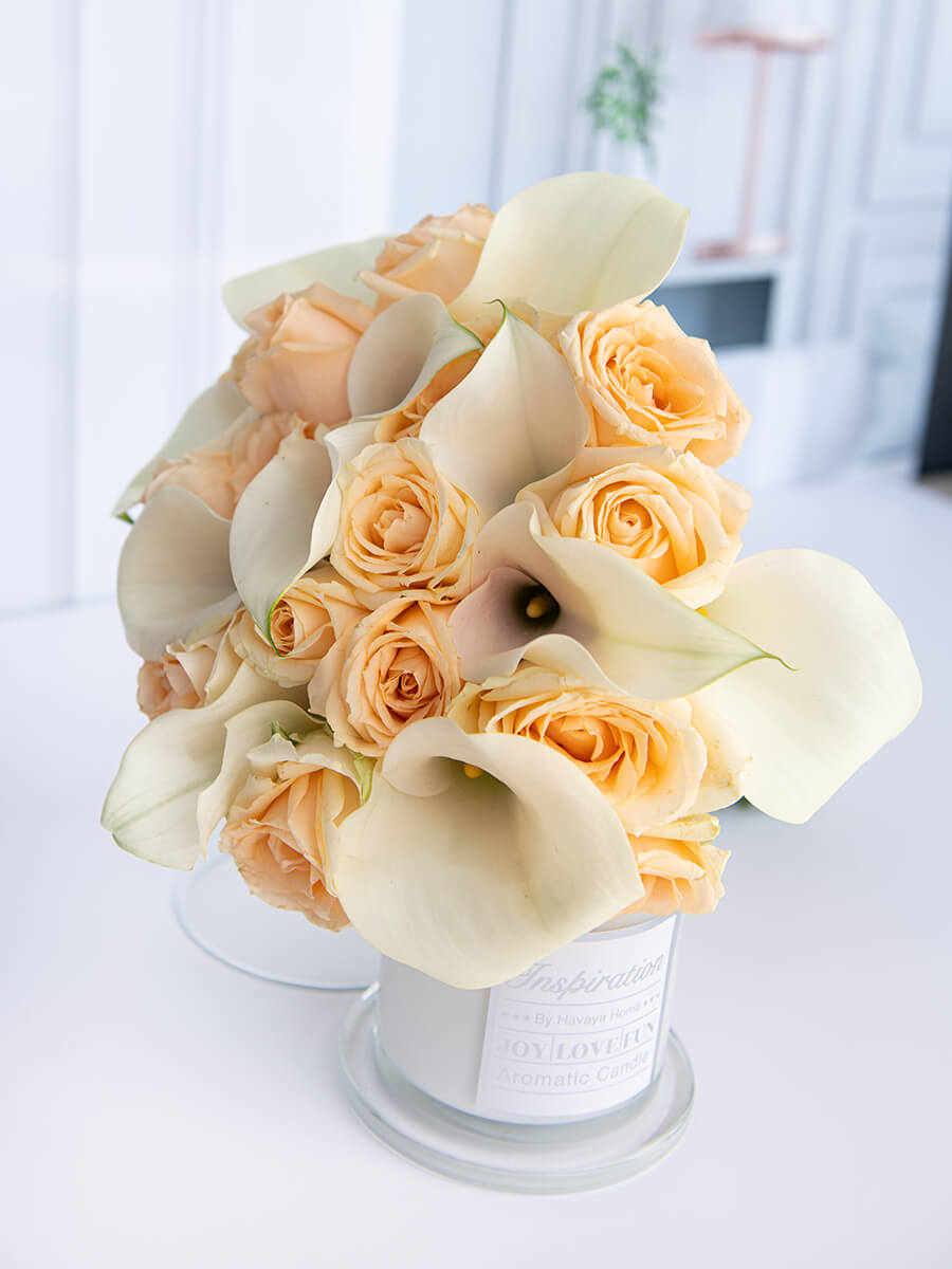 זר כלה מרהיב המכיל כ- 15 ורדי פיץ’ וכ-10 קאלות לבנות מדהימות ביופיין.