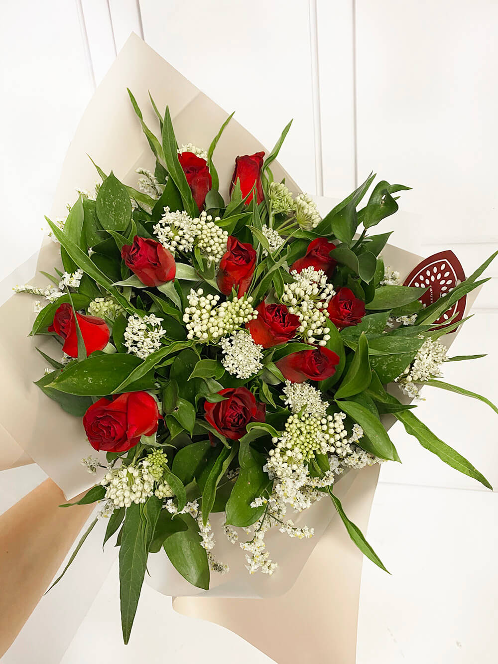זר שופע המכיל 11 ורדים לבלי רד, סינדרלה לבנה ולימונים לבן/שעווה.