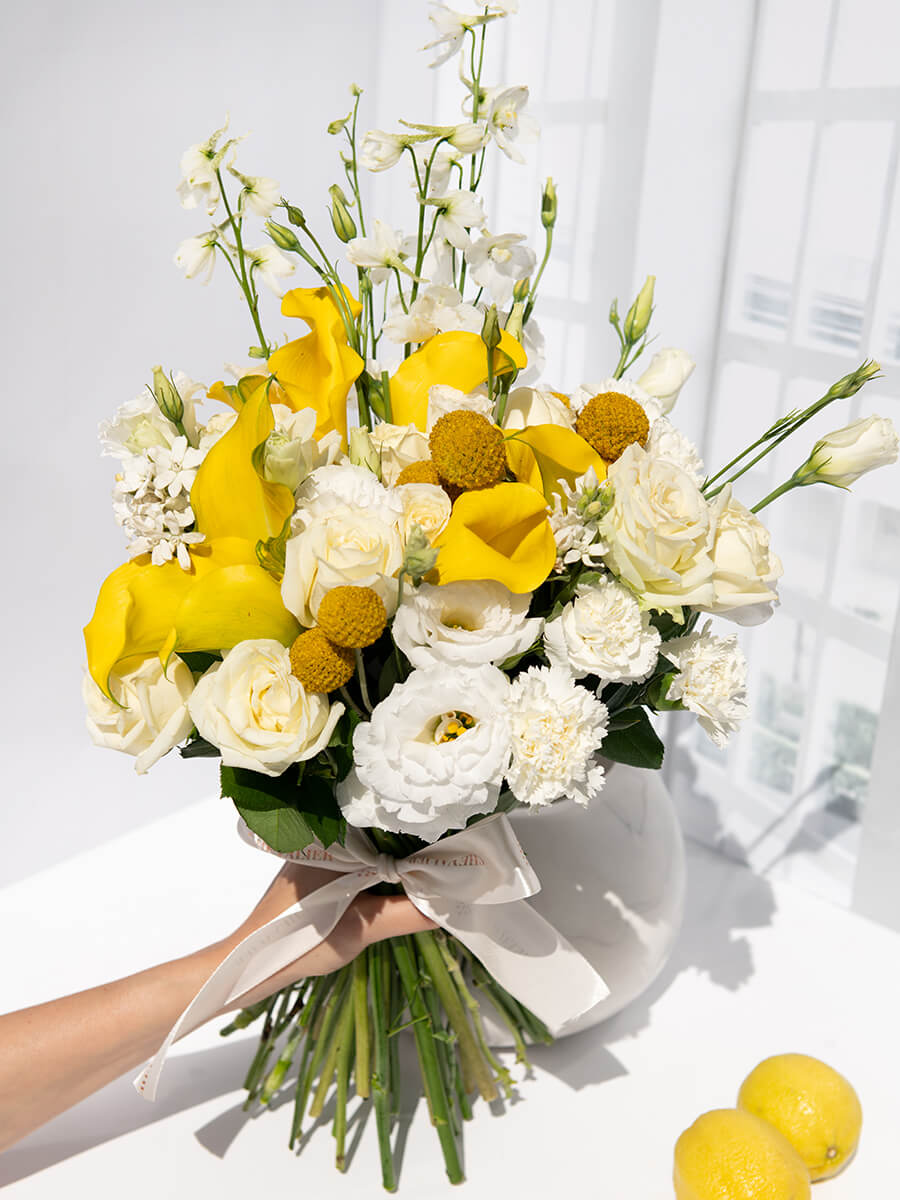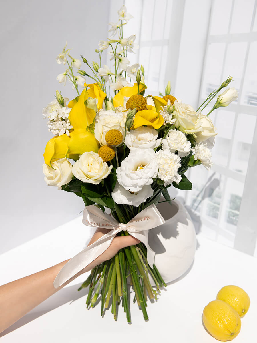 זר פרחים ייחודי בגווני צהוב ולבן, המשלב קאלות צהובות מרהיבות עם ורדים לבנים, ציפורן לבנה ופרחים נוספים. מגיע עטוף בנייר איכותי עמיד במים, ובסרט עדין ומלא בסטייל.