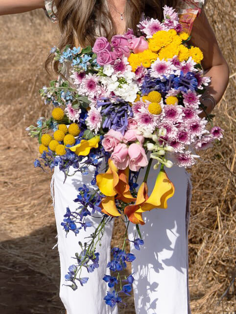 הזר מכיל קאלות כתומות, דולפניום סגול, חרציות, קרספידיה צהובה, ורדים בגווני ורוד, טווידה תכלת ועוד.