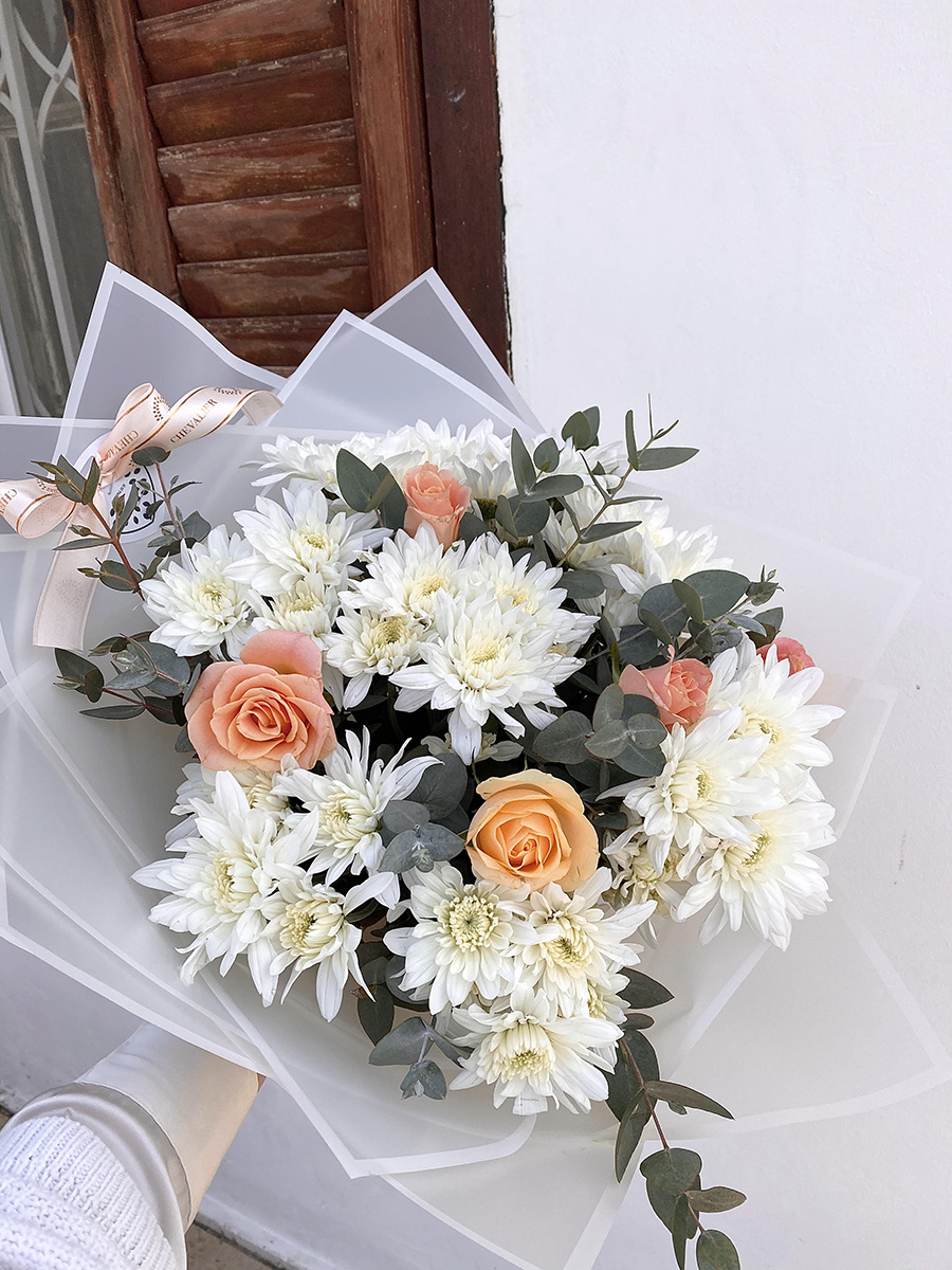 זר קסום וחם המשלב בתוכו פרחים בגווני לבן פיץ