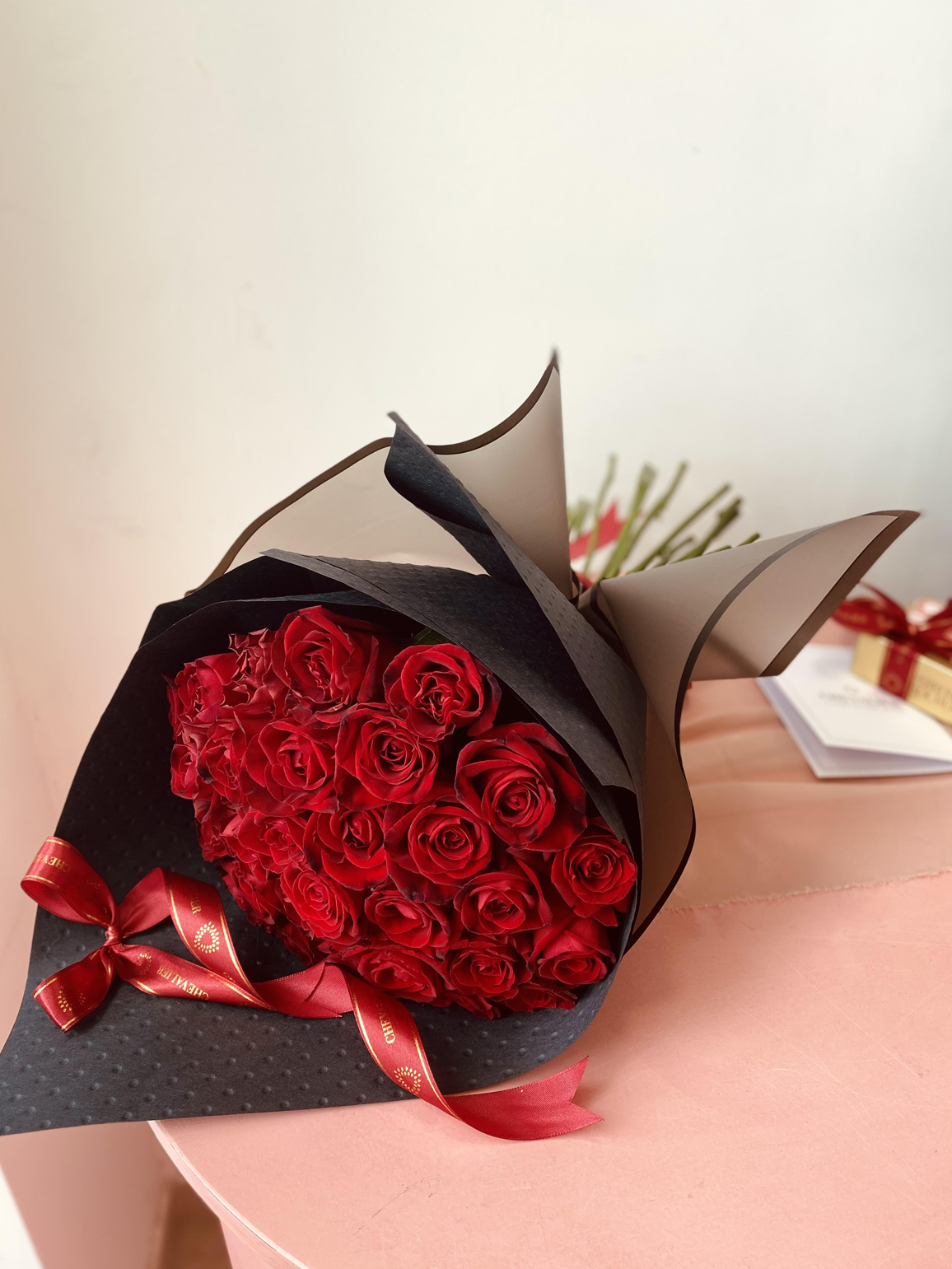 מגיע עטוף בנייר איכותי עמיד במים, ובסרט עדין ומלא בסטייל. להשלמת הפינוק, ניתן לצרף יין ושוקולד.