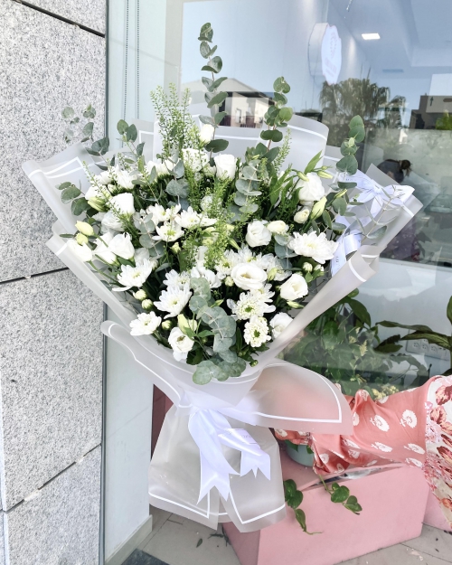 הפרחים עטופים בעטיפה יוקרתית ועמידה במים, וסרטי סאטן מהודרים שמוסיפים טאצ’ נקי וסטייל.