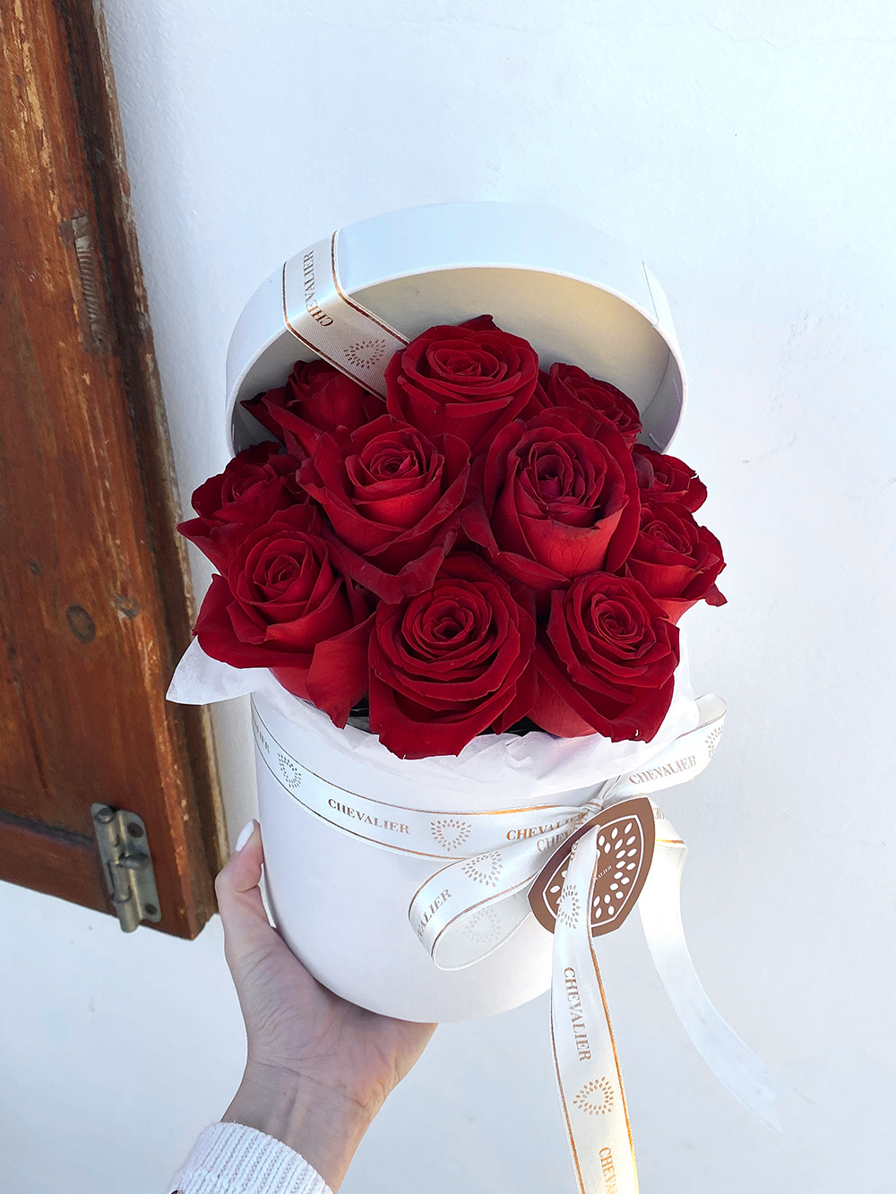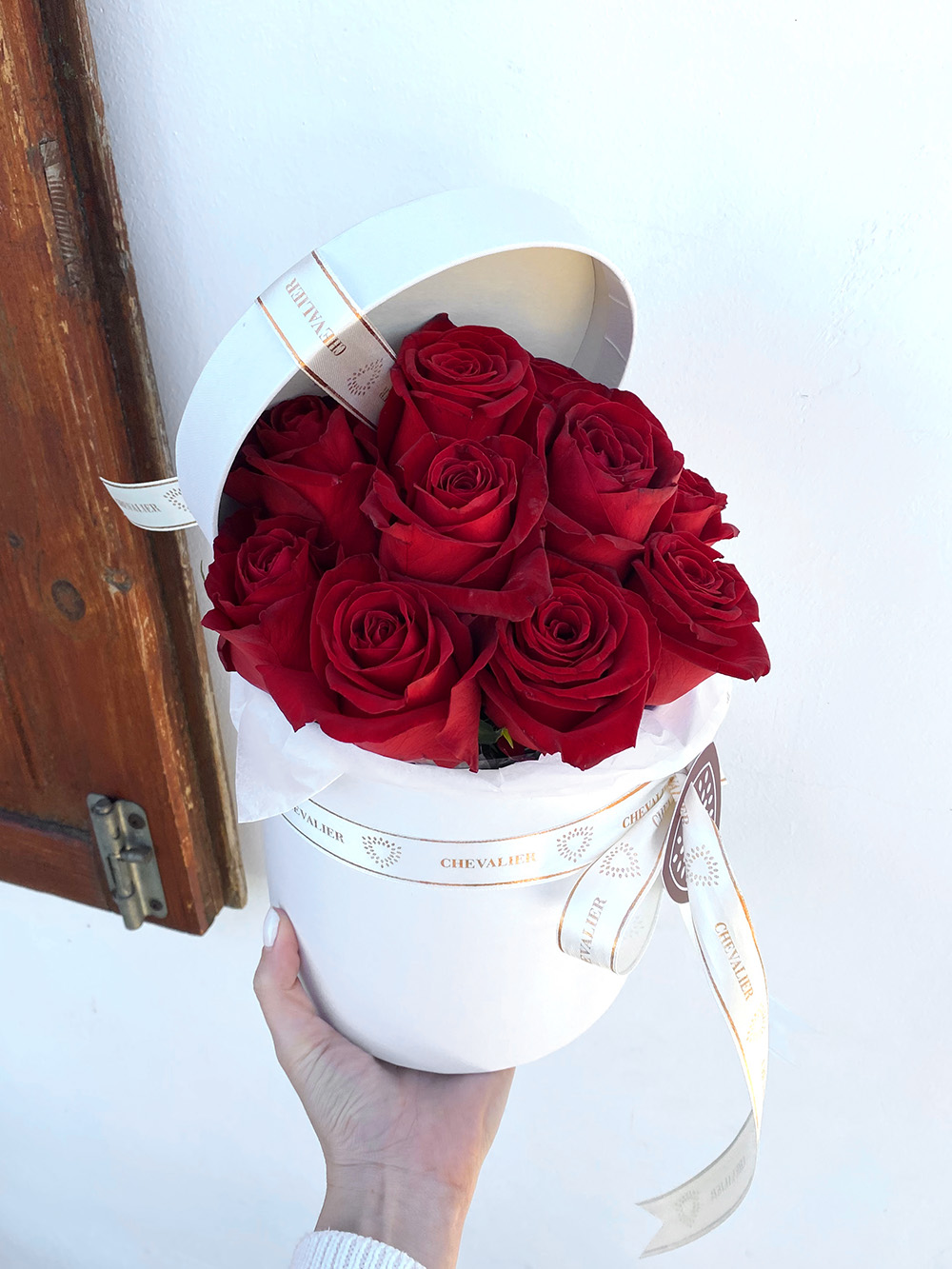 קופסת ורדים אדומים יוקרתית ואלגנטית בצבע לבן, המשולבת עם מכסה, הקופסא קיימת ב- 3 גדלים. ניתן להוסיף למארז שוקולד פררו רושה.