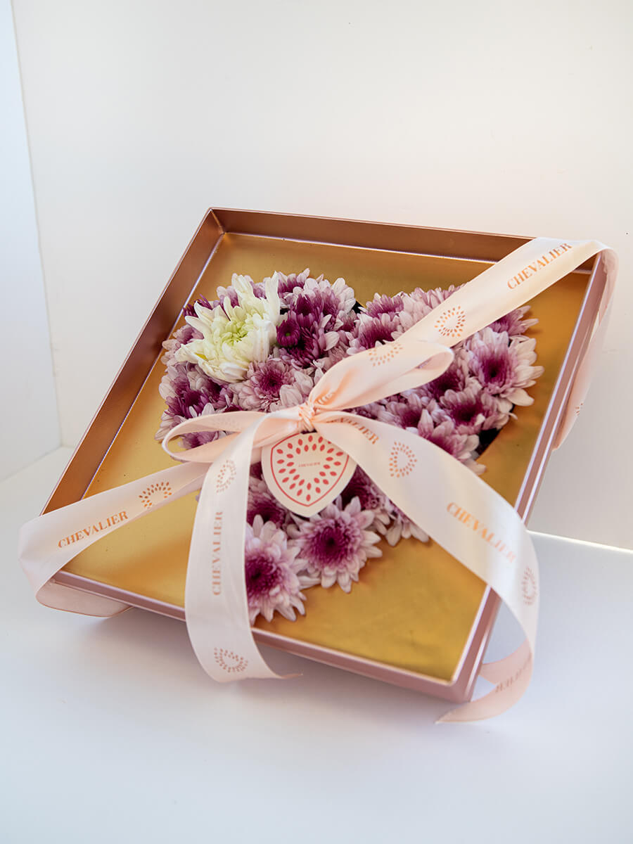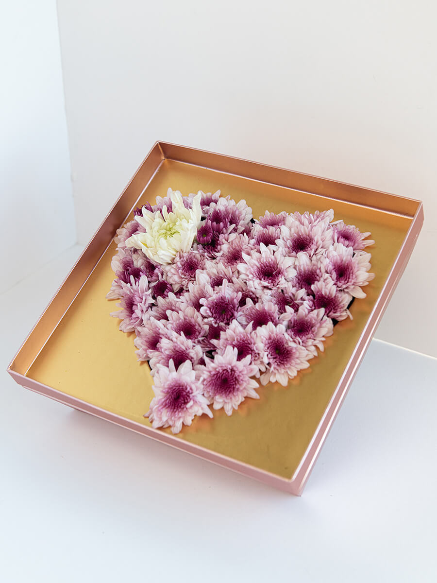 סידור בצורת לב בצבעי ורוד, פוקסיה ולבן המגיע בקופסה ורודה קשיחה ואיכותית, מכיל חרציות ורודות וחרצית לבנה.