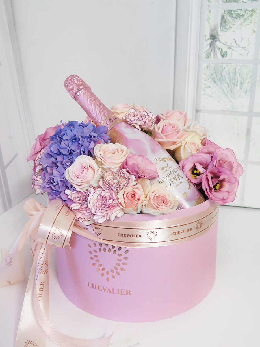 קופסת פרחים ענקית ומרשימה, המשלבת מגוון רחב של פרחים בגווני ורוד בייבי, לבן ותכלת/סגול שהופכים את הסידור למשוגע ונחשק. המארז מגיע עם שמפנייה.