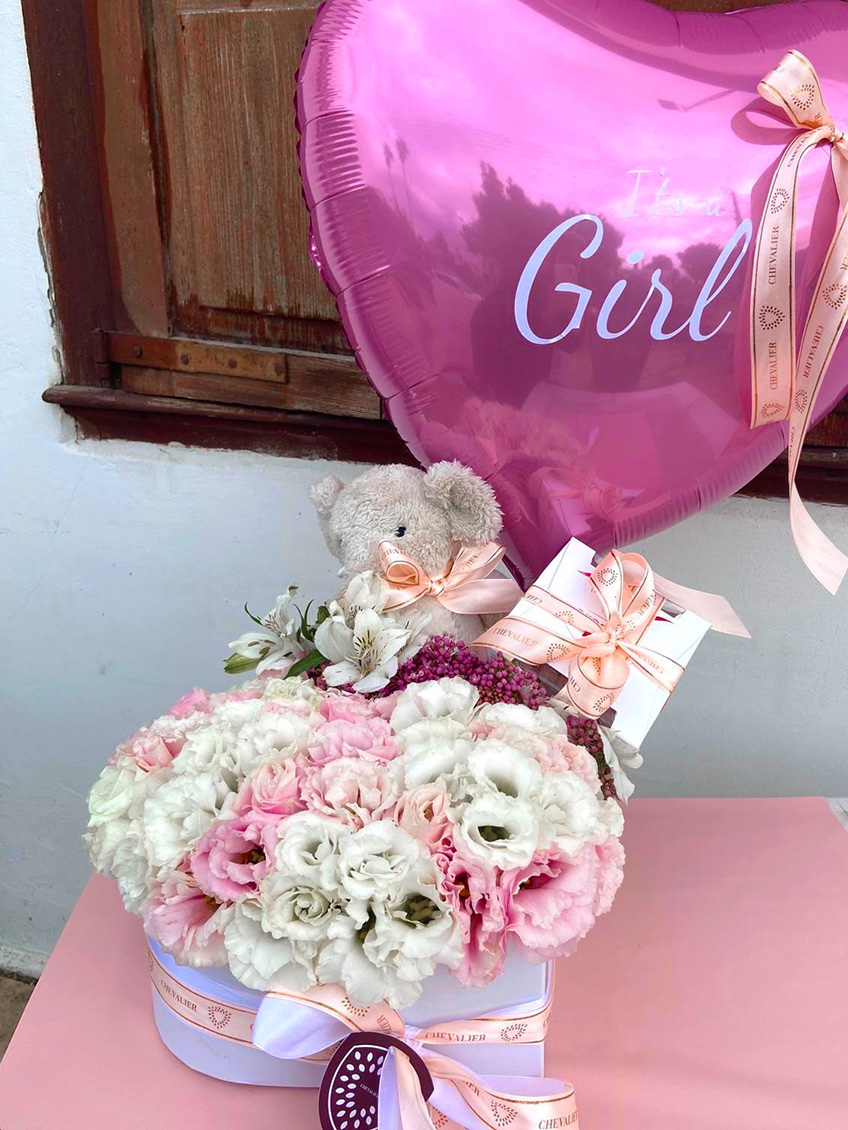 מארז פרחים ללידת הבת, בכל הגדלים המארז מכיל קופסת לב לבנה מרשימה ומדהימה ביופיה, המשלבת פרחים בגווני לבן וורוד. בנוסף, מכיל דובי קטן ובלון מיילר ורוד עם כיתוב “Girl” המארז קיים ב- 3 גדלים.