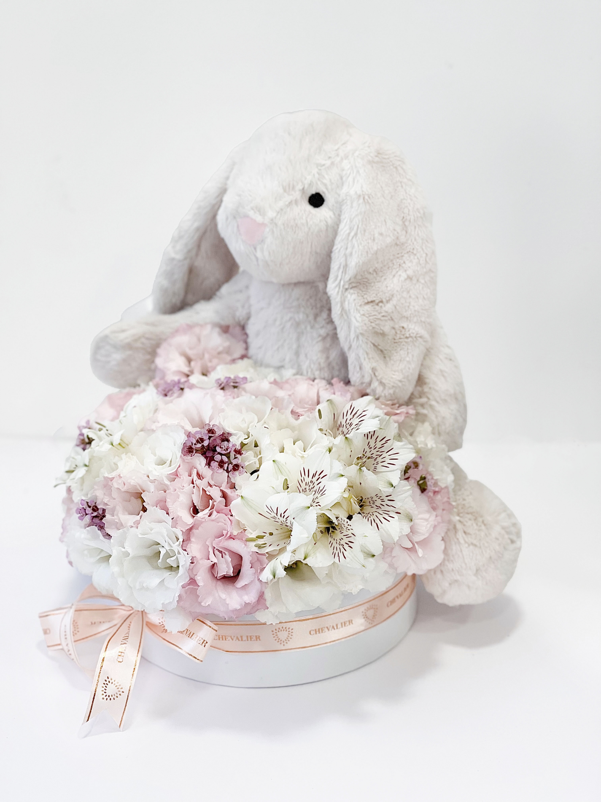 סידור עגול להולדת הבת.. פרחים בגווני לבן ורוד מרהיבים ומרגשים משולבים עם דובי רך (משתנה בהתאם למלאי החנות) וסרטים עדינים.
