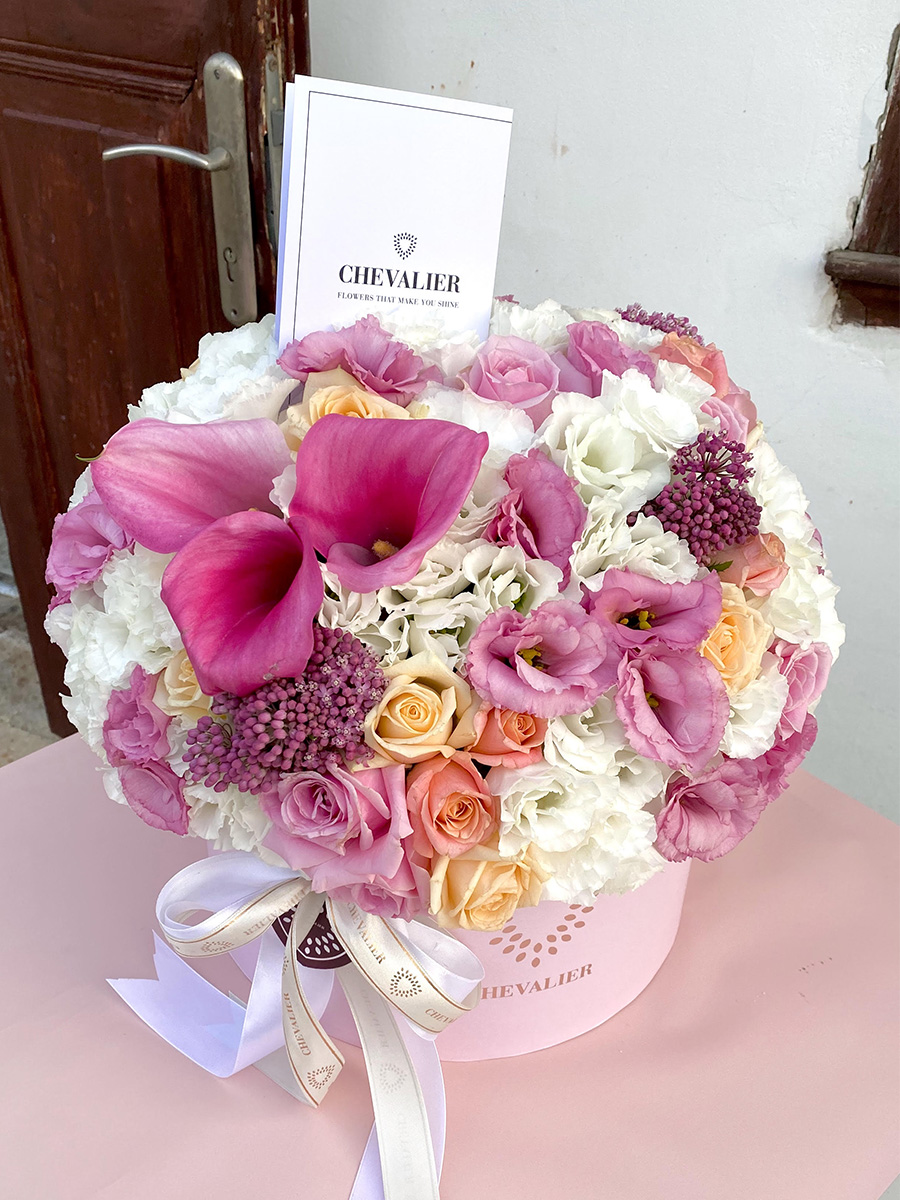 קופסת פרחים ענקית ומרהיבה, המשלבת מגוון רחב של פרחים בגווני ורוד כתום ולבן, עם שלישית קאלות בצבע ורוד או סגול בהתאם למלאי החנות, השזורים זה ובזה ויוצרים הרמוניה מוחלטת.
