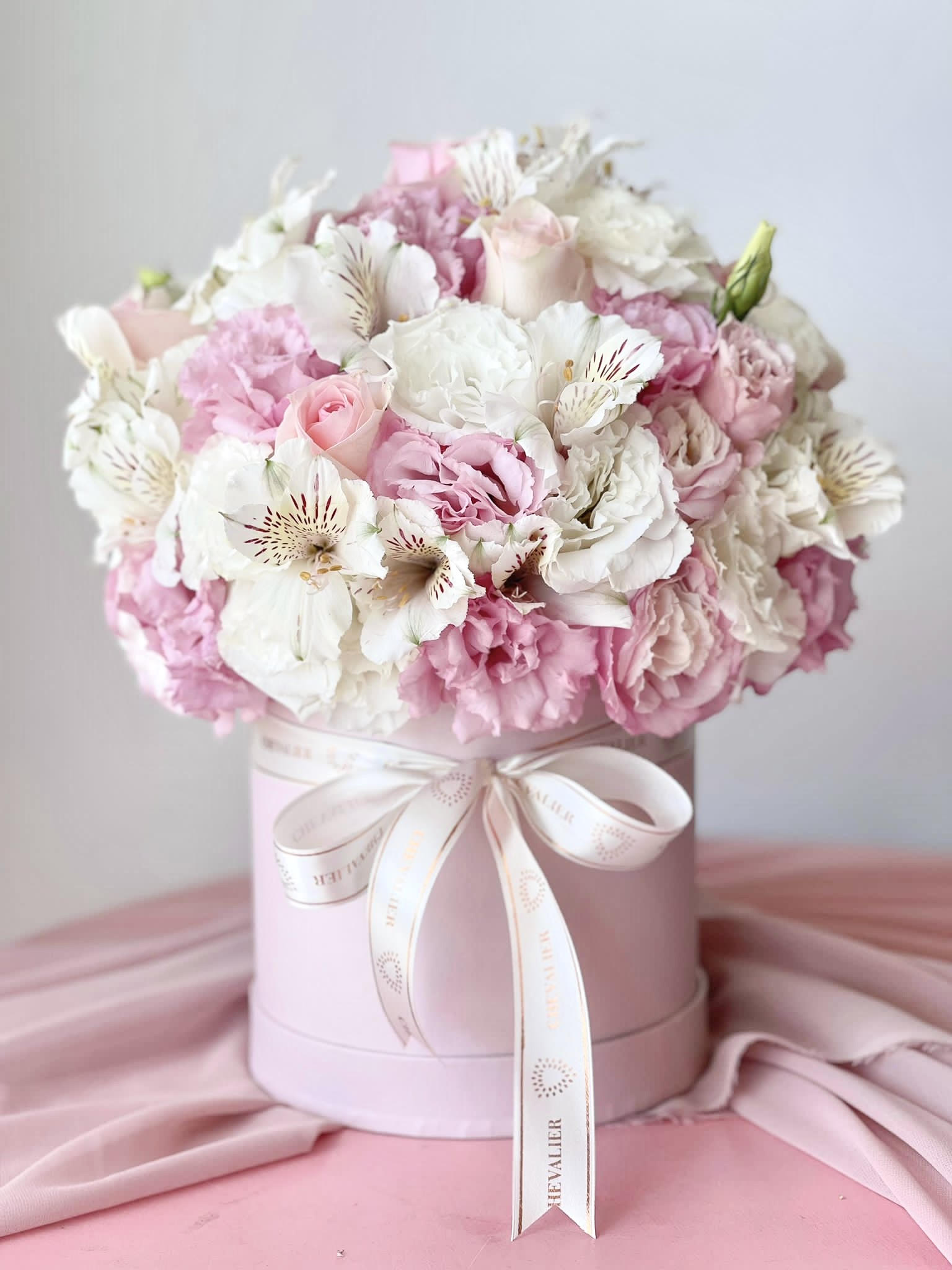 סידור עגול וגבוהה קסום בצבעי לבן, ורוד עם פרחי העונה וסרטים רומנטיים.
