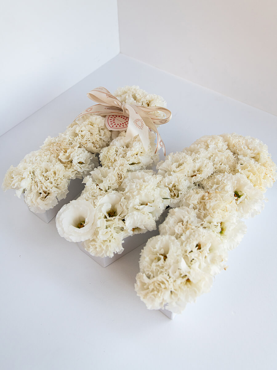 סידור אות לבחירה המפוצץ בפרחי ליזיאנטוס לבנים.
