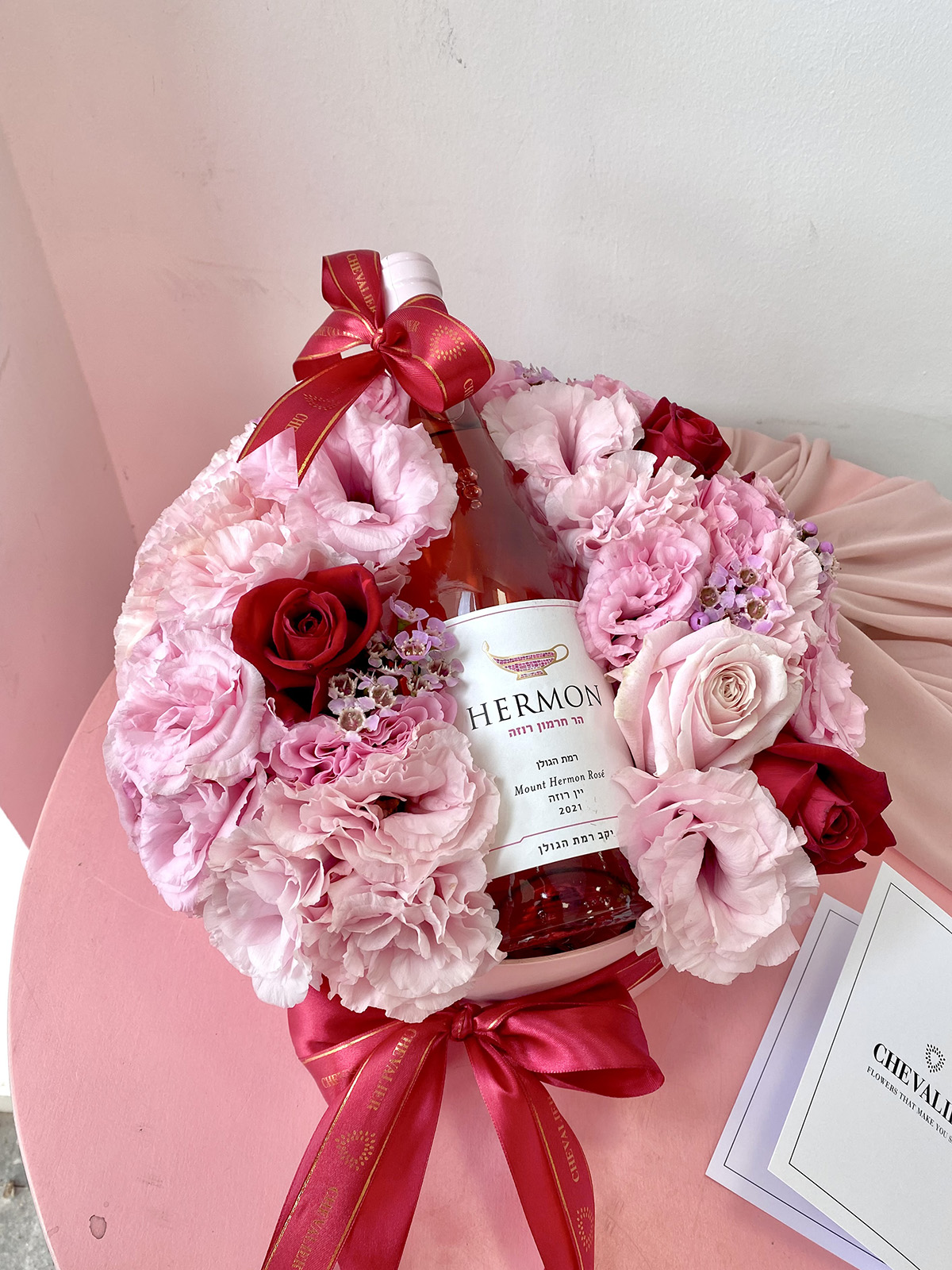 סידור פרחים בקופסא עגולה בצבעי ורוד ואדום. הסידור מגיע עם יין רוזה וסרטים מלאים בסטייל.