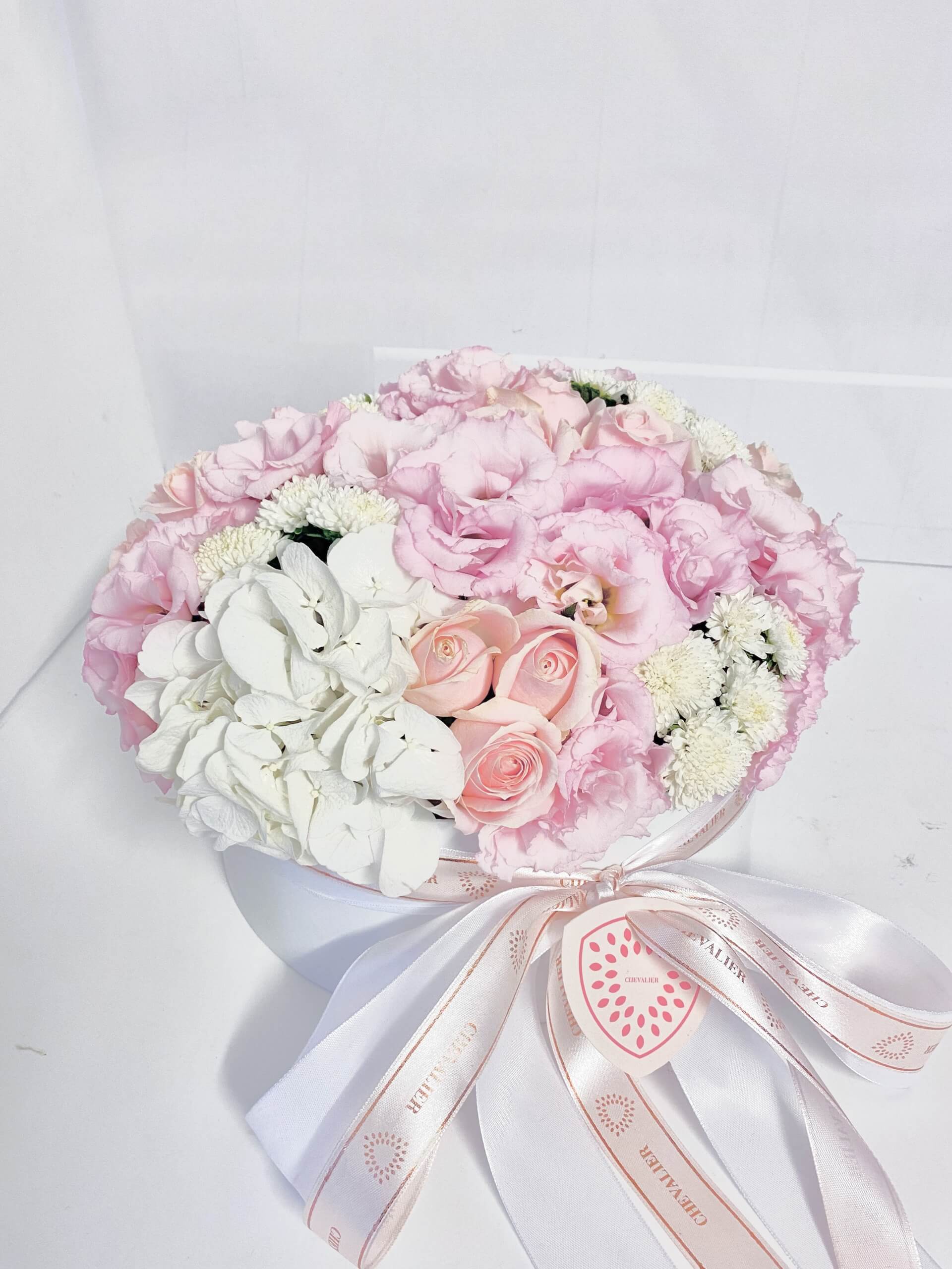 קופסת פרחים עגולה ומרשימה, המשלבת מגוון רחב של פרחים בגווני ורוד בייבי ולבן. הקופסא קיימת ב- 3 גדלים – גדול, בינוני וקטן.