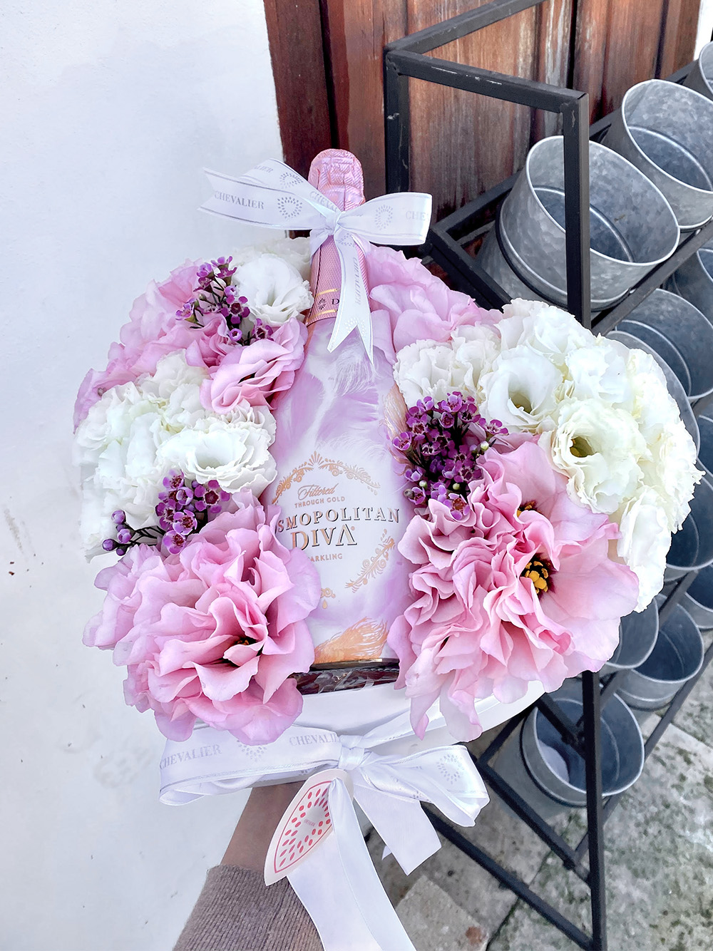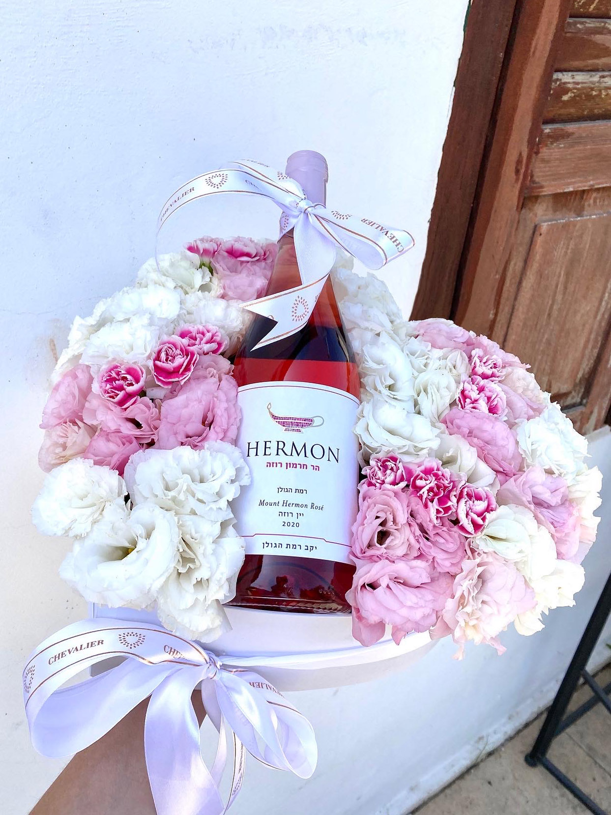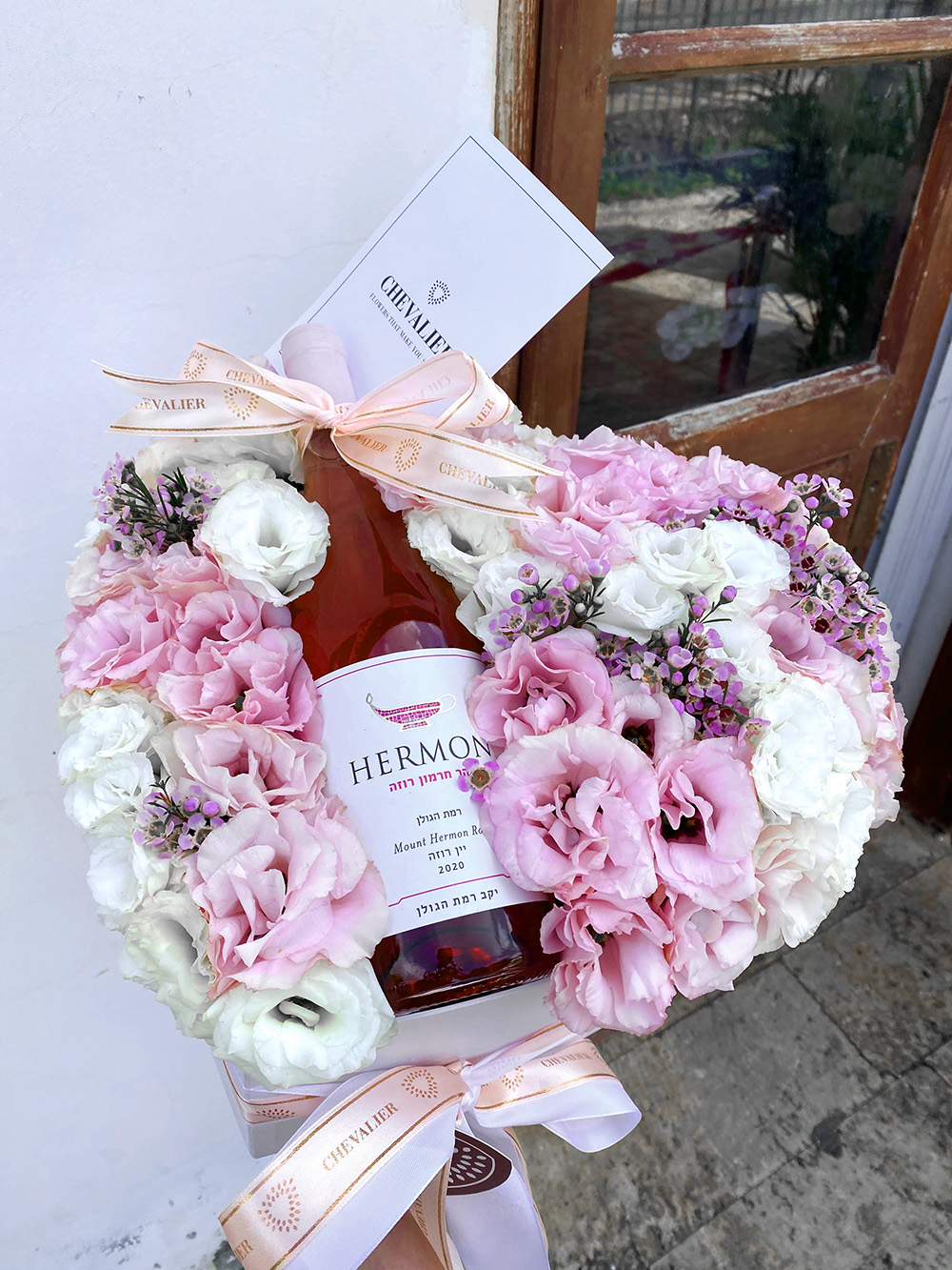 סידור לב קסום בצבעי לבן, ורוד , הסידור מגיע עם יין רוזה וסרטים מלאים בסטייל.