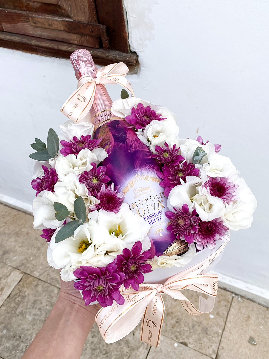 סידור קופסת לב קטנה בגווני ויולט, עם שמפניית ” קוסמופוליטן דיווה” המשלב בתוכו פרחי ליזיאנטוסים לבנים וחרציות סגולות.