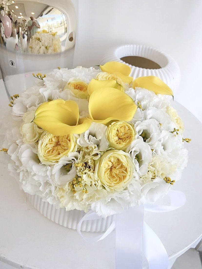 סידור עגול בכלי חרסינה עם פסים לבנים משלוב פרחים מרהיבים ועמידים בגווני לבן וצהוב.