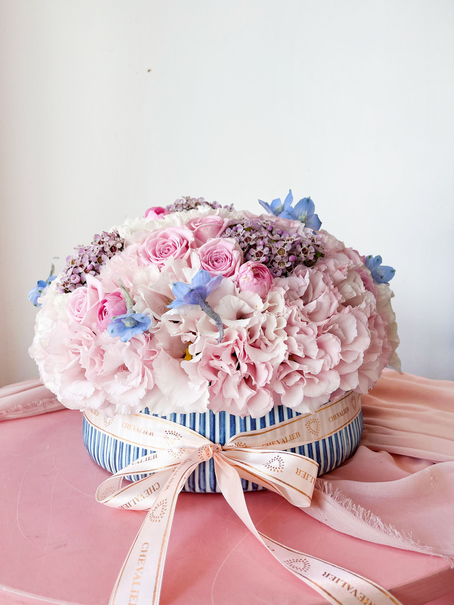 סידור עגול בכלי חרסינה עם פסים כחולים משלוב פרחים מרהיבים ועמידים בגווני ורוד ותכלת.