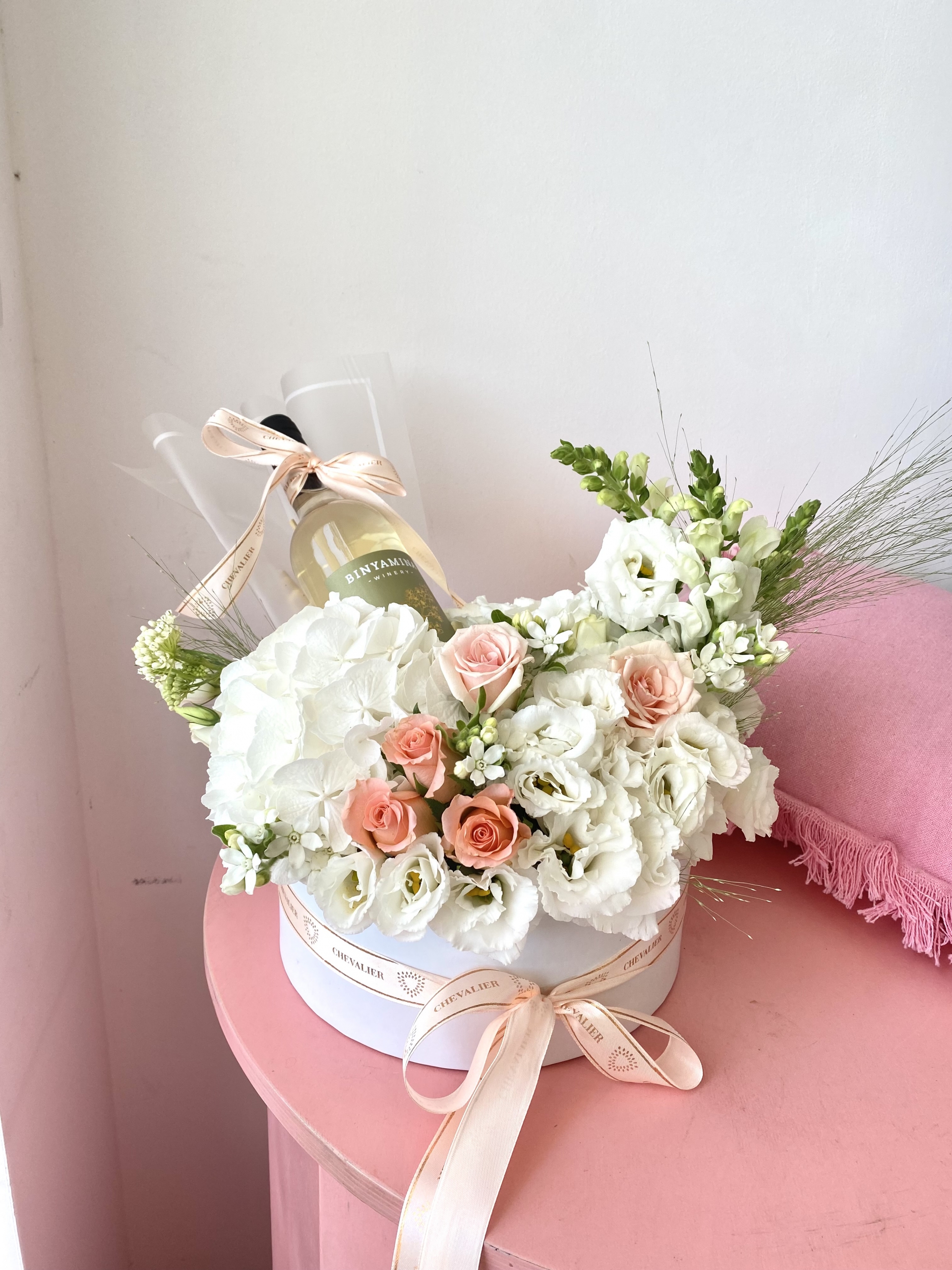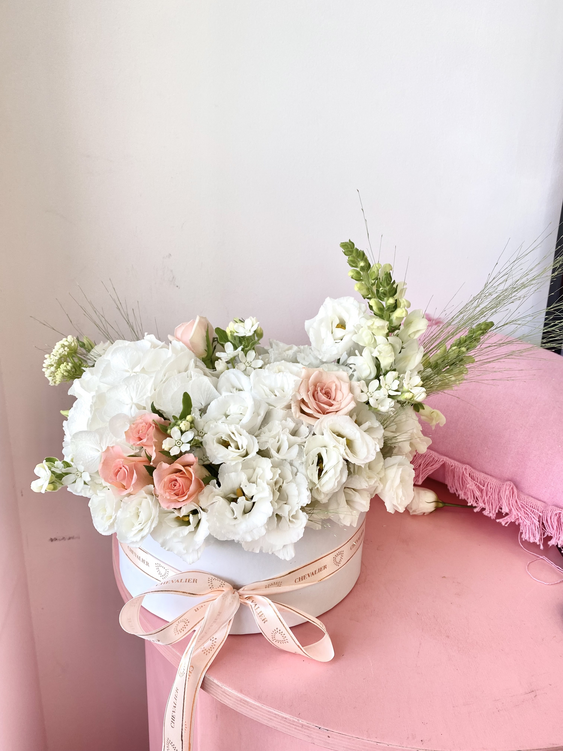 סידור עגול בגווני לבן, פיץ וירוק בשזירה מיוחדת, מרשימה וחגיגית.