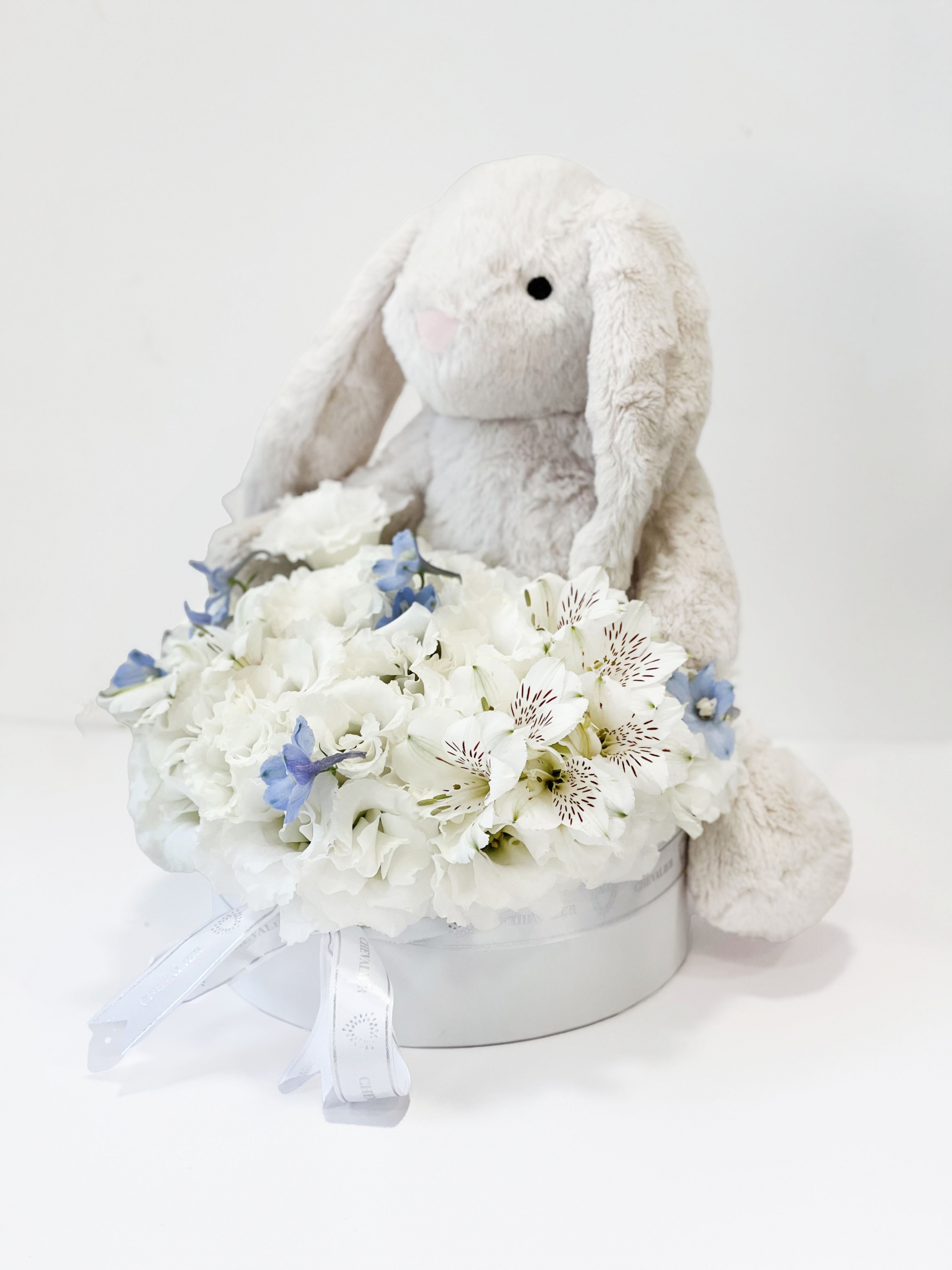 סידור עגול להולדת הבן.. פרחים בגווני לבן ותכלת מרהיבים ומרגשים משולבים עם דובי רך (משתנה בהתאם למלאי החנות) וסרטים עדינים.