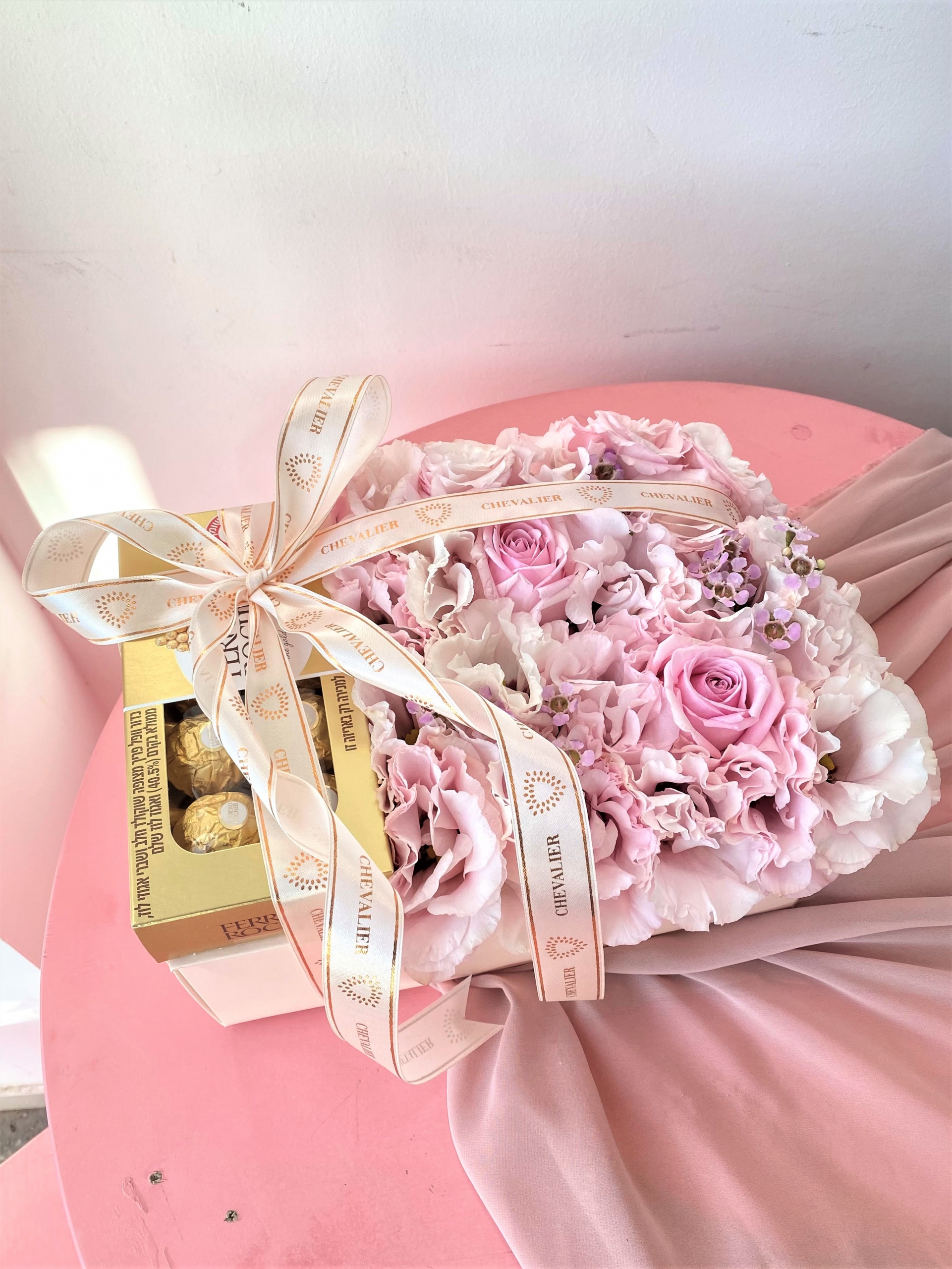 סידור בקופסא מרובעת משולב עם פרחים מרהיבים בגווני ורוד ומארז שוקולד פררו רושה עטופים בסרטים רומנטיים.