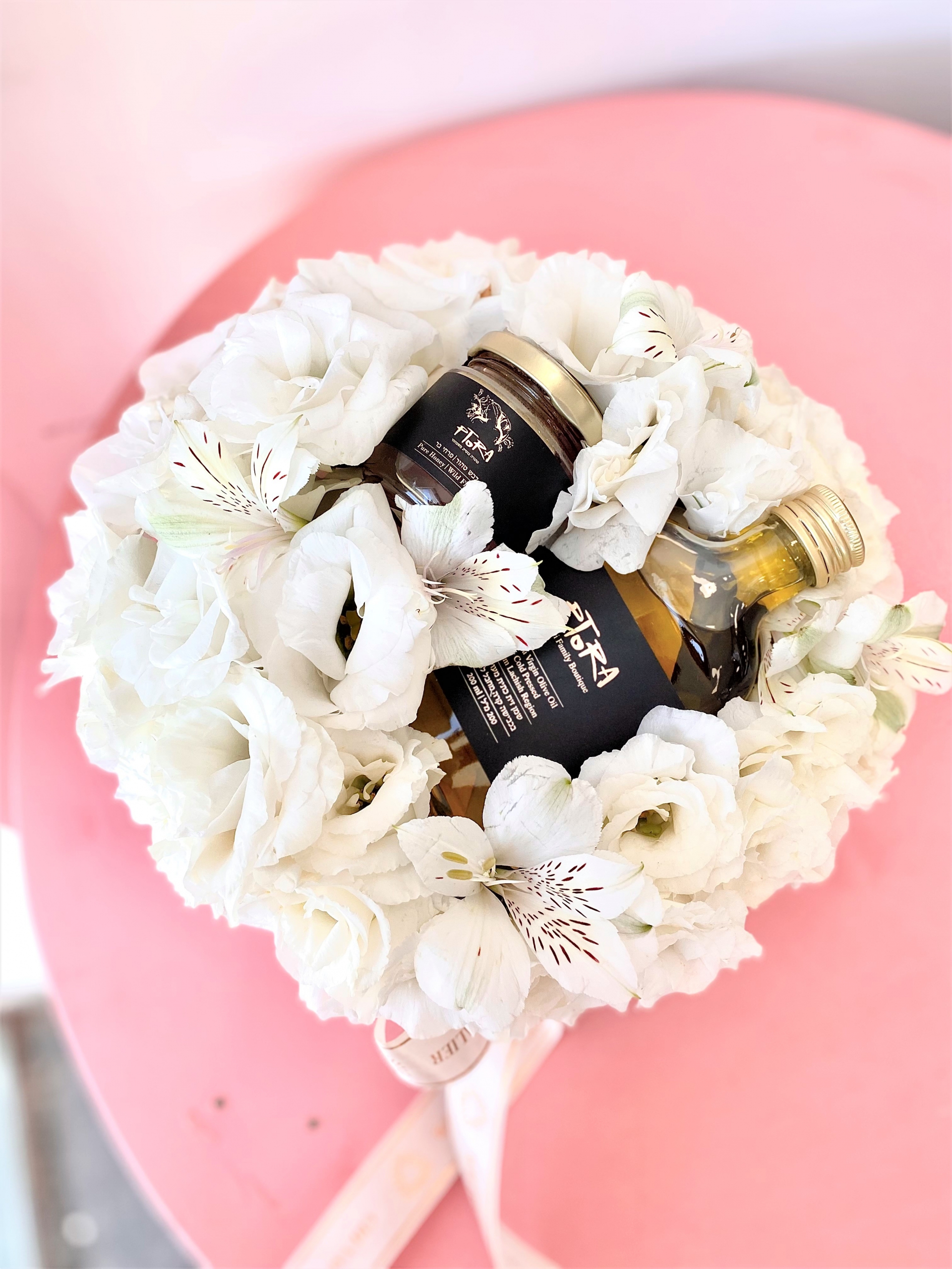 סידור פרחים חגיגי בקופסא עגולה בגווני לבן המורכב מפרחי העונה. המארז משולב עם שמן “ווסקי” וצנצנת דבש טהור 250 גרם (כשר למהדרין).
