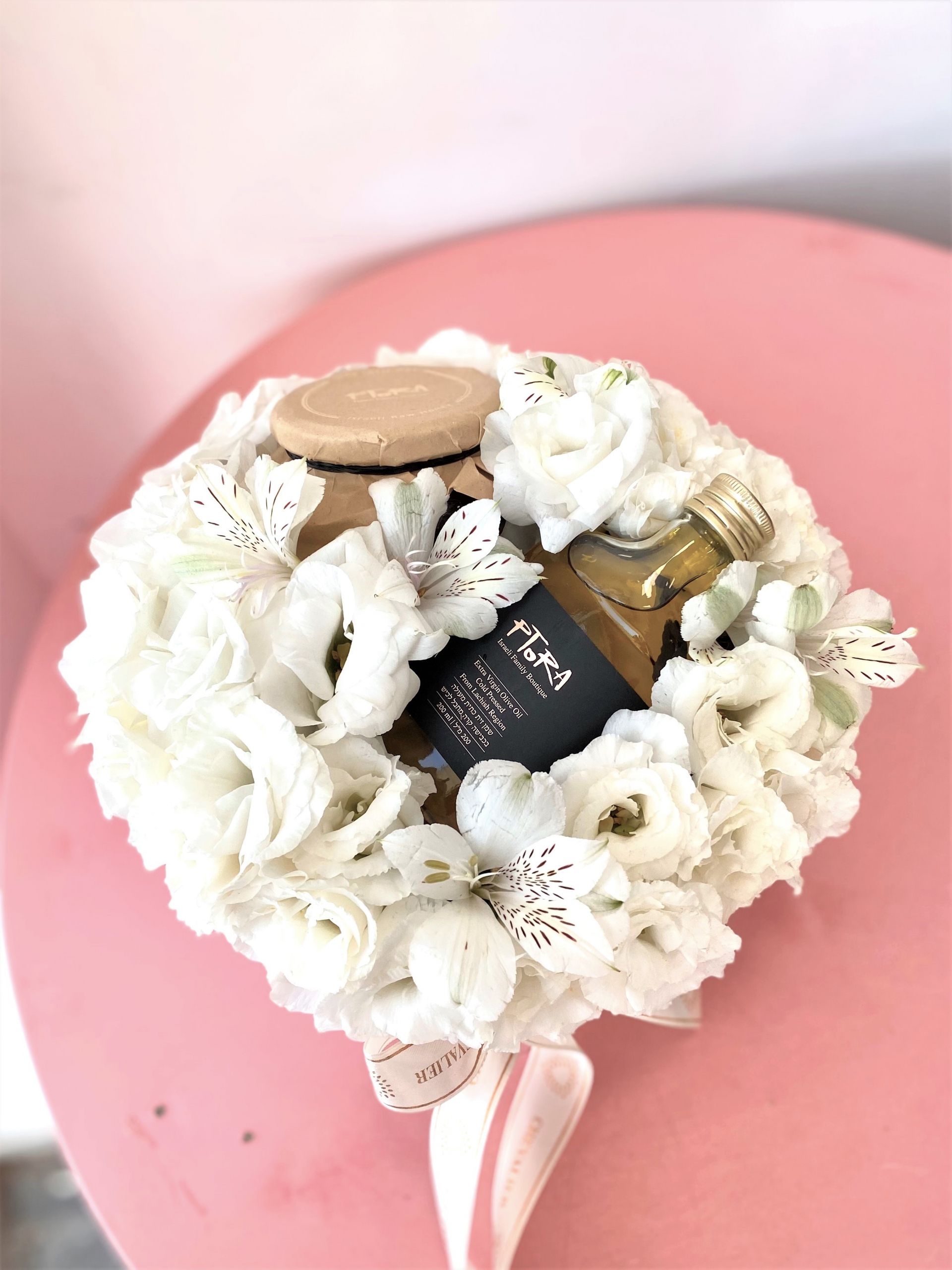 סידור פרחים חגיגי בקופסא עגולה בגווני לבן המורכב מפרחי העונה. המארז משולב עם שמן “ווסקי” וצנצנת דבש טהור עגולה המיוצרים בבוטיק פטורה (כשר למהדרין).
